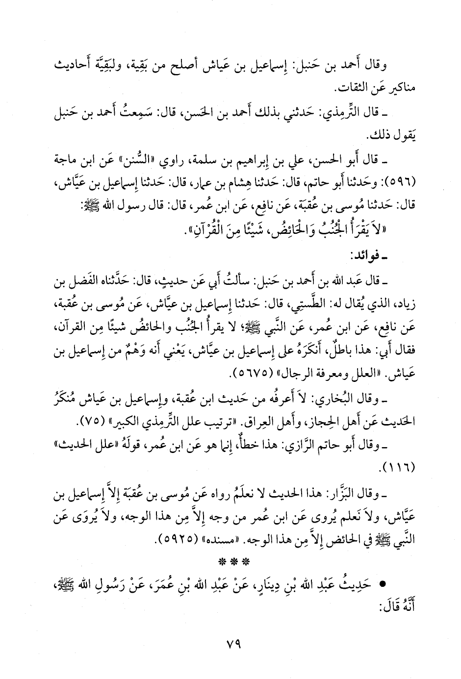 - وقال عبد الله بن أحمد بن حنبل: سألت أبي عن حديث، قال: حدثناه الفضل بن زياد، الذي يقال له: الطستي، قال: حدثنا إسماعيل بن عياش، عن موسى بن عُقبة، عن نافع، عن ابن عمر، عن النبي صَلى الله عَليه وسَلم؛ لا يقرأ الجنب والحائض شيئًا من القرآن، فقال أبي: هذا باطل، أنكره على إسماعيل بن عياش، يعني أنه وهم من إسماعيل بن عياش. «العلل ومعرفة الرجال» (٥٦٧٥).