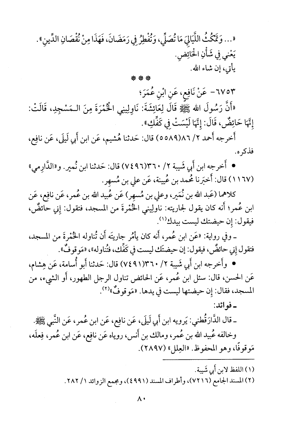 كلاهما (عبد الله بن نُمير, وعلي بن مُسهِر) عن عُبيد الله بن عمر، عن نافع، عن ابن عمر؛ أنه كان يقول لجاريته: ناوليني الخمرة من المسجد، فتقول: إني حائض، فيقول: إن حيضتك ليست بيدك (¬١).