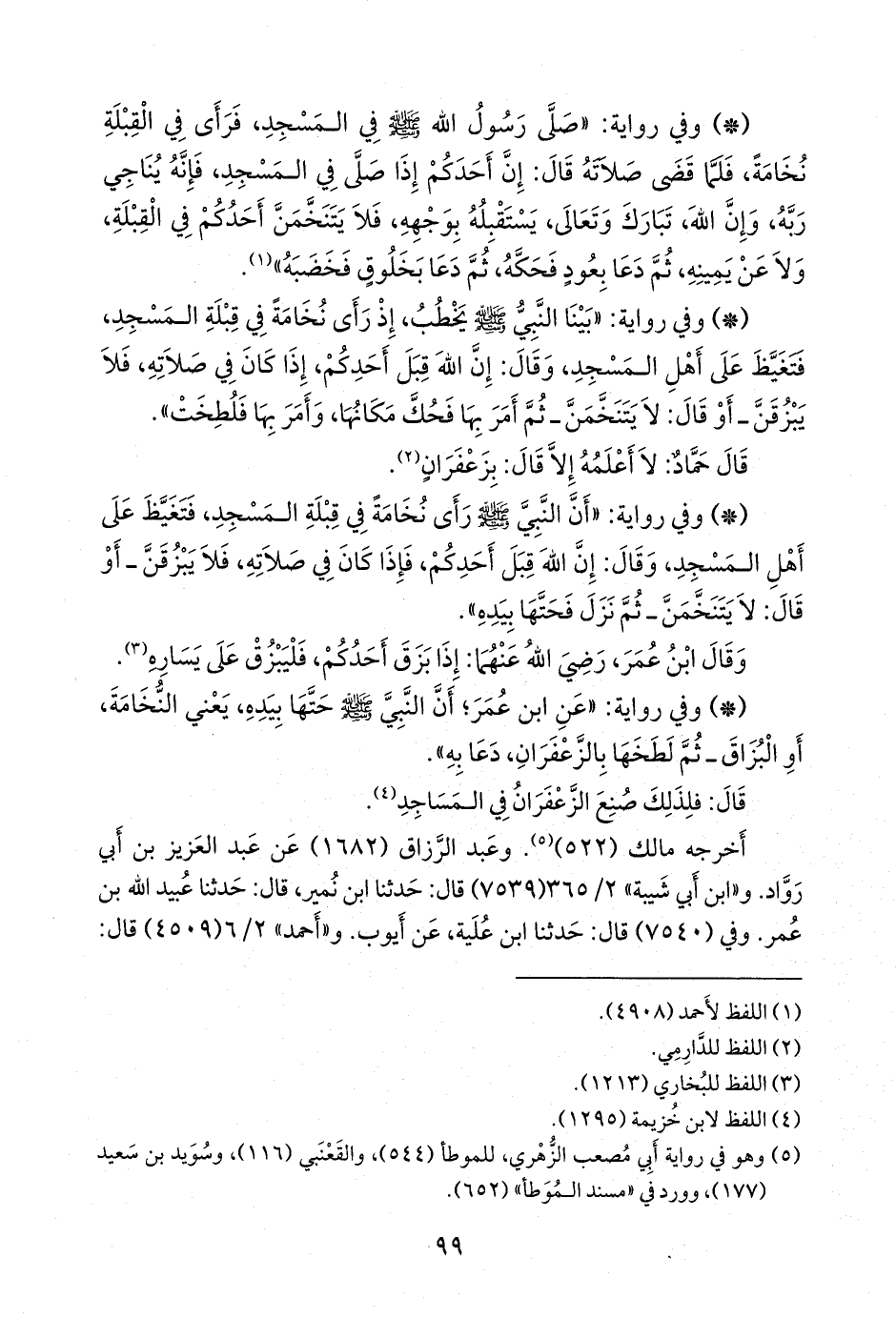 - وفي رواية: «صلى رسول الله صَلى الله عَليه وسَلم في المسجد، فرأى في القبلة نخامة، فلما قضى صلاته قال: إن أحدكم إذا صلى في المسجد، فإنه يناجي ربه، وإن الله، تبارك وتعالى، يستقبله بوجهه، فلا يتنخمن أحدكم في القبلة، ولا عن يمينه، ثم دعا بعود فحكه، ثم دعا بخلوق فخضبه» (¬١).