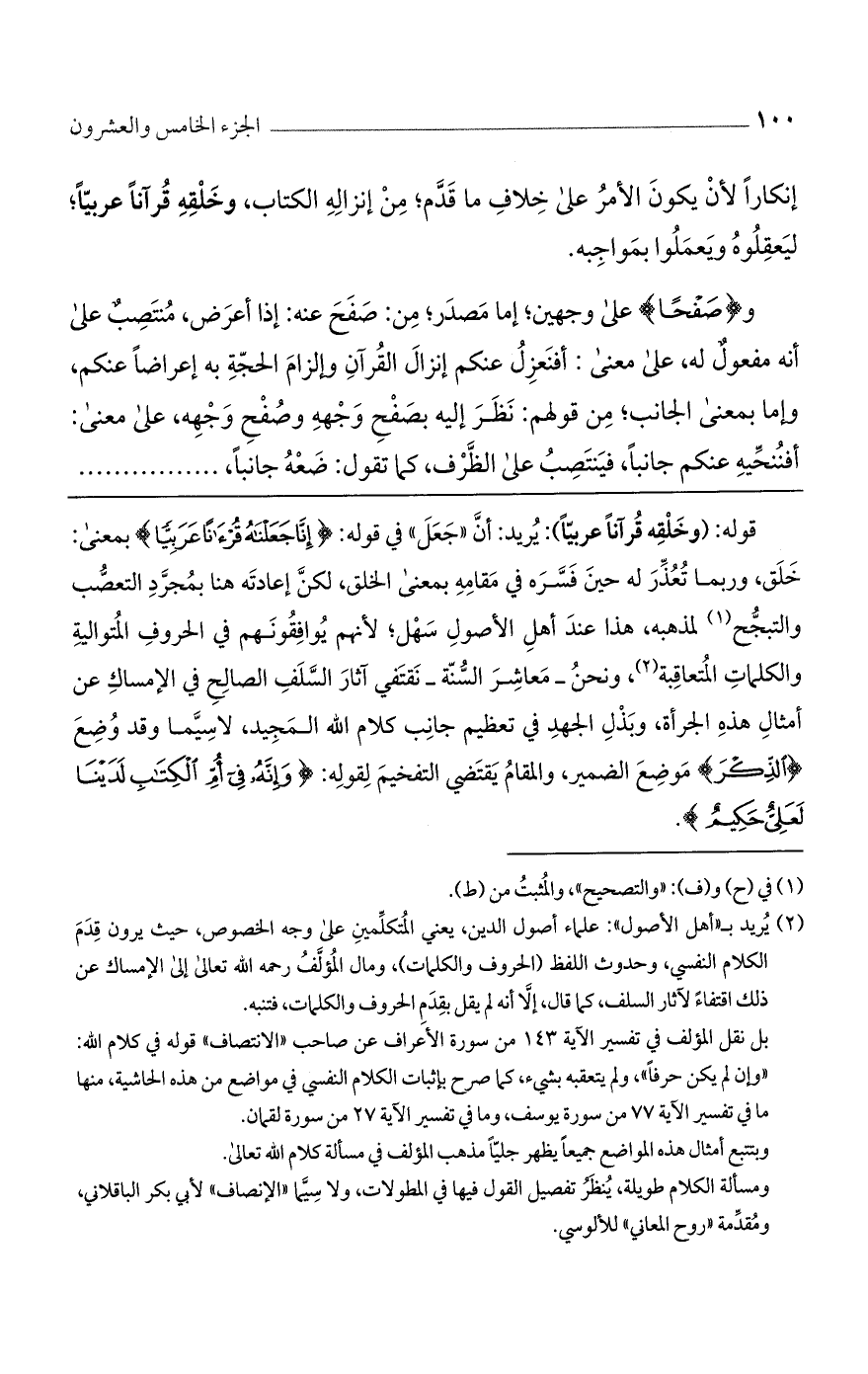 قوله: (وخلقه قرآنًا عربيًا): يريد: أن "جعل" في قوله: {إنَّا جَعَلْنَاهُ قُرْآنًا عَرَبِيًا} بمعنى: خلق، وربما تعذر له حين فسره في مقامه بمعنى الخلق، لكن إعادته هنا بمجرد التعصب والتبجح لمذهبه، هذا عند أهل الأصول سهل؛ لأنهم يوافقونهم في الحروف المتوالية والكلمات المتعاقبة، ونحن -معاشر السنة- نقتفي آثار السلف الصالح في الإمساك عن أمثال هذه الجرأة، وبذل الجهد في تعظيم جانب كلام الله المجيد، لاسيما وقد وضع {الذِّكْرَ} موضع الضمير، والمقام يقتضي التفخيم لقوله: {وإنَّهُ فِي أُمِّ الكِتَابِ لَدَيْنَا لَعَلِيٌّ حَكِيمٌ}.