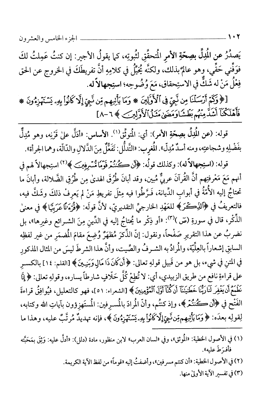 قوله: (استجهالًا له): وكذلك قوله: {أَن كُنتُمْ قَوْمًا مُّسْرِفِينَ} استجهالًا لهم في أنهم مع معرفتهم أن القرآن عربي مبين، وقد أبان طرق الهدى من طرق الضلالة، وأبان ما تحتاج إليه الأمة في أبواب الديانة، فرطوا فيه مثل تفريط من لم يعرف ذلك وشك فيه، فالتعريف في {الذِّكْرَ} للعهد الخارجي التقديري، لأن قوله: {قُرْآنًا عَرَبِيًا} في معنى الذكر، قال في سورة (ص): "أو ذكر ما يحتاج إليه في الدين من الشرائع وغيرها"، بل نضرب عن هذا التقدير صفحًا، ونقول: أن الذكر مظهر وضع مقام المضمر من غير لفظه السابق إشعارًا بالعلية، والمراد به الشرف والصيت، وأن هذا الشرط ليس من المثال المذكور في المتن في شيء، بل هو من قبيل قوله تعالى: {أَنْ كَانَ ذَا مَالٍ وَبَنِينَ} [القلم: 14] بالكسر على قراءة نافع من طريق الزبيدي، أي: لا تطع كل حلاف شارطًا يساره، وقوله تعالى: {إِنَّا نَطْمَعُ أَنْ يَغْفِرَ لَنَا رَبُّنَا خَطَايَانَا أَنْ كُنَّا أَوَّلَ الْمُؤْمِنِينَ} [الشعراء: 51]، فهو كالتعليل، فيوافق قراءة الفتح في {أَن كُنتُمْ}، وإذ كنتم وأن المراد بالمسرفين: المستهزؤون بآيات الله وكتابه، لقوله بعده: {ومَا يَاتِيهِم مِّن نَّبِيٍّ إلاَّ كَانُوا بِهِ يَسْتَهْزِئُونَ}، فإنه تهديد مرتب عليه، وهذا ما