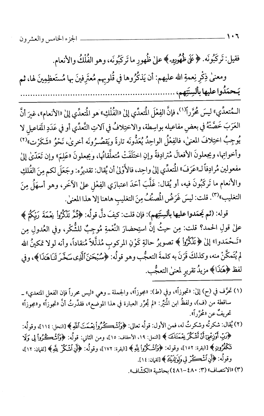 المتعدي" ليس محررًا، فإن الفعل المتعدي إلى "الفلك" هو المتعدي إلى "الأنعام"، غير أن العرب خصته في بعض مفاعيله بواسطة، والاختلاف في آلات التعدي أو في عدد المفاعيل لا يوجب اختلاف المعنى، فالفعل الواحد يعدونه تارةً ويقصرونه أخرى، نحو "شكرت" وأخواتها، ويجعلون الأفعال مترادفة وإن اختلفت متعلقاتها، ويجعلون "علم" وإن تعدى إلى مفعولين مرادفًا لـ "عرف" المتعدي إلى واحد، فالأولى أن يقال: تقديره: وجعل لكم من الفلك والأنعام ما تركبون فيه، أو يقال: غلب أحد اعتباري الفعل على الآخر، وهو أسهل من التغليب". قلت: ليس غرض المصنف من التغليب هاهنا إلا هذا المعنى.