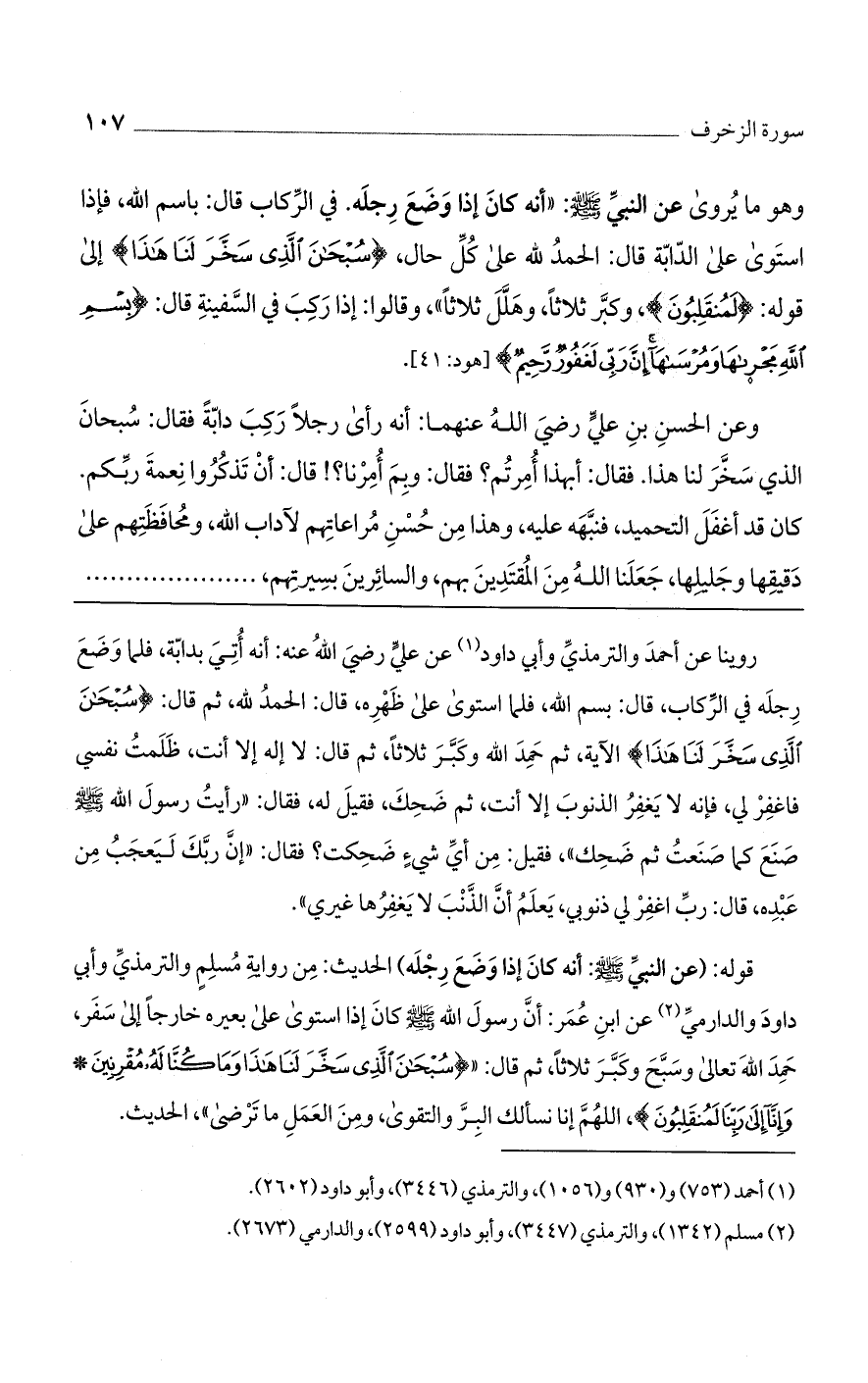 روينا عن أحمد والترمذي وأبي داود عن علي رضي الله عنه: أنه أتي بدابة، فلما وضع رجله في الركاب، قال: بسم الله، فلما استوى على ظهره، قال: الحمد الله، ثم قال: {سُبْحَانَ الَّذِي سَخَّرَ لَنَا هَذَا} الآية، ثم حمد الله وكبر ثلاثًا، ثم قال: لا إله إلا أنت، ظلمت نفسي فاغفر لي، فإنه لا يغفر الذنوب إلا أنت، ثم ضحك، فقيل له، فقال: "رأيت رسول الله صلى الله عليه وسلم صنع كما صنعت ثم ضحك"، فقيل: من أي شيء ضحكت؟ فقال: "إن ربك ليعجب من عبده، قال: رب اغفر لي ذنوبي، يعلم أن الذنب لا يغفرها غيري".