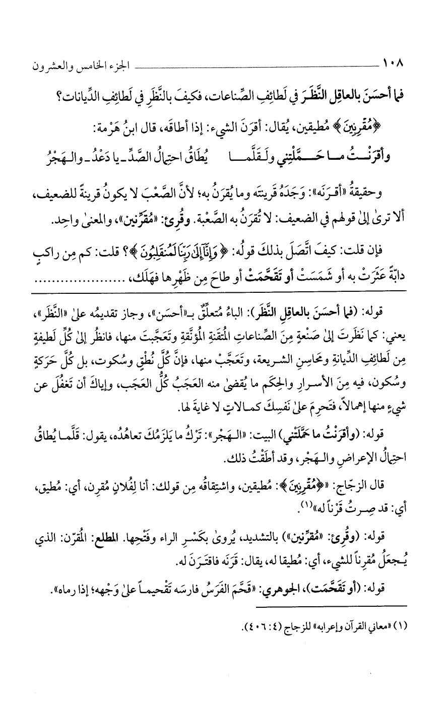 قوله" (وقرئ: "مقرنين") بالتشديد، يروى بكسر الراء وفتحها. المطلع: المقرن: الذي يجعل مقرنًا للشيء، أي: مطيقا له، يقال: قرنه فاقترن له.