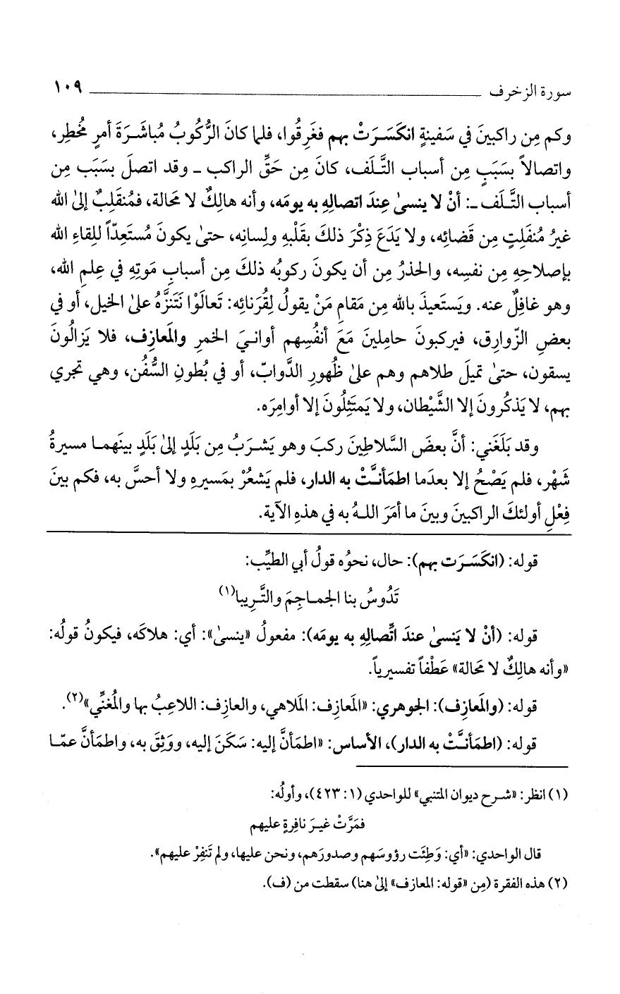 وكم من راكبين في سفينة انكسرت بهم فغرقوا، فلما كان الركوب مباشرة أمر مخطر، واتصالًا بسبب من أسباب التلف، كان من حق الراكب -وقد اتصل بسبب من أسباب التلف-: أن لا ينسى عند اتصاله به يومه، وأنه هالك لا محالة، فمنقلب إلى الله غير منفلت من قضائه، ولا يدع ذكر ذلك بقلبه ولسانه، حتى يكون مستعدًا للقاء الله بإصلاحه من نفسه، والحذر من أن يكون ركوبه ذلك من أسباب موته في علم الله، وهو غافل عنه، ويستعيذ بالله من مقام من يقول لقرنائه: تعالوا نتنزه على الخيل، أو في بعض الزوارق، فيركبون حاملين مع أنفسهم أواني الخمر والمعازف، فلا يزالون يسقون، حتى تميل طلاهم وهم على ظهور الدواب، أو في بطون السفن، وهي تجرى بهم، لا يذكرون إلا الشيطان، ولا يمتثلون إلا أوامره.