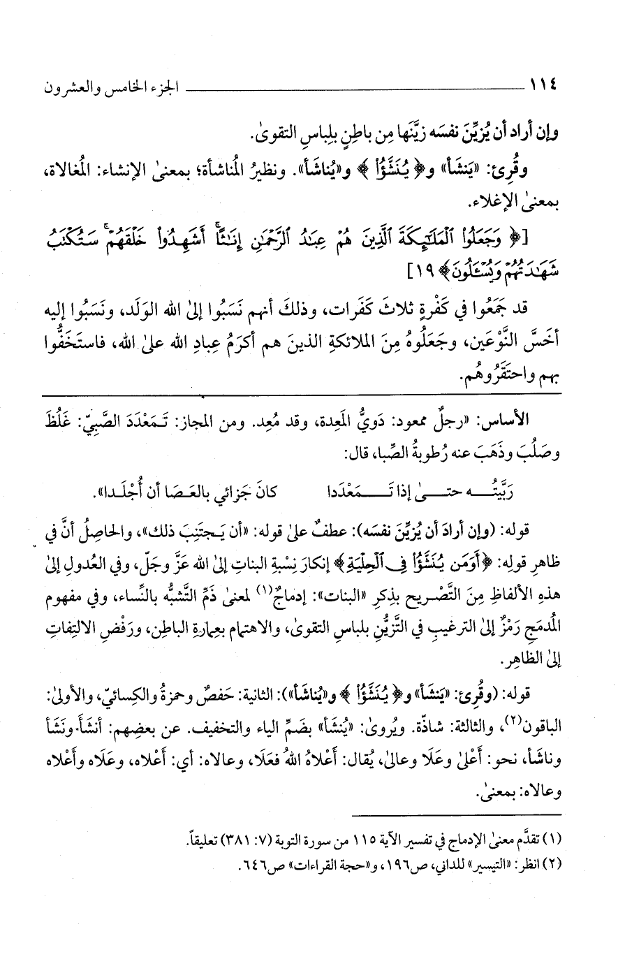 قول: (وقرئ: "ينشأ" و {يُنَشَّأُ} و "يناشأ"): الثانية: حفص وحمزة والكسائي، والأولى: الباقون، والثالثة: شاذة. ويروي: "ينشأ" بضم الياء والتخفيف. عن بعضهم: أنشأ. ونشأ وناشأ، نحو: أعلى وعلا وعالى، يقال: أعلاه الله فعلا، وعالاه: أي: أعلاه، وعلاه وأعلاه وعالاه: بمعنى.