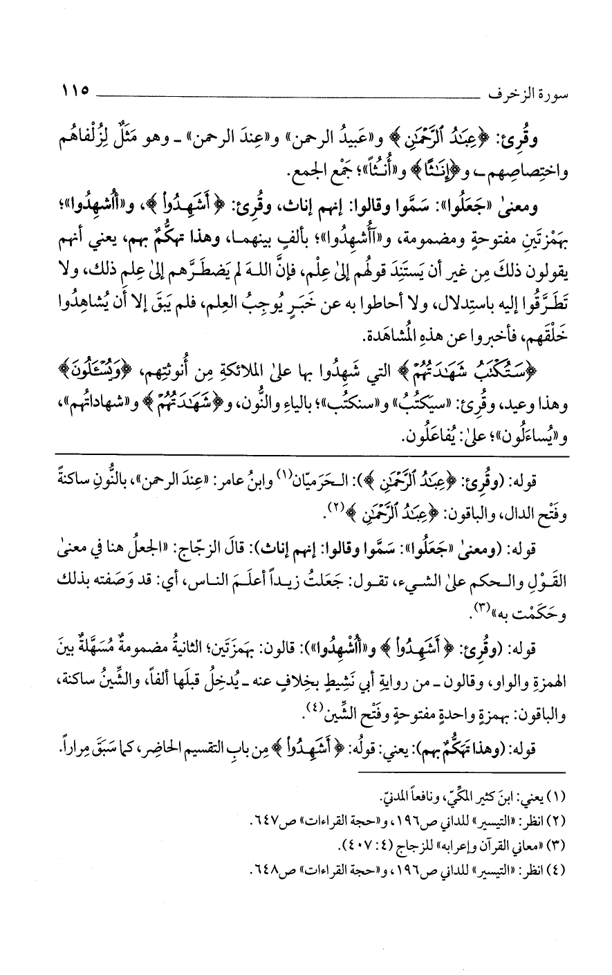 قوله: (وقرئ: {عِبَادُ الرَّحْمَنِ}): الحرميان وابن عامر: "عند الرحمن"، بالنون ساكنةً وفتح الدال، والباقون: {عِبَادُ الرَّحْمَنِ}.