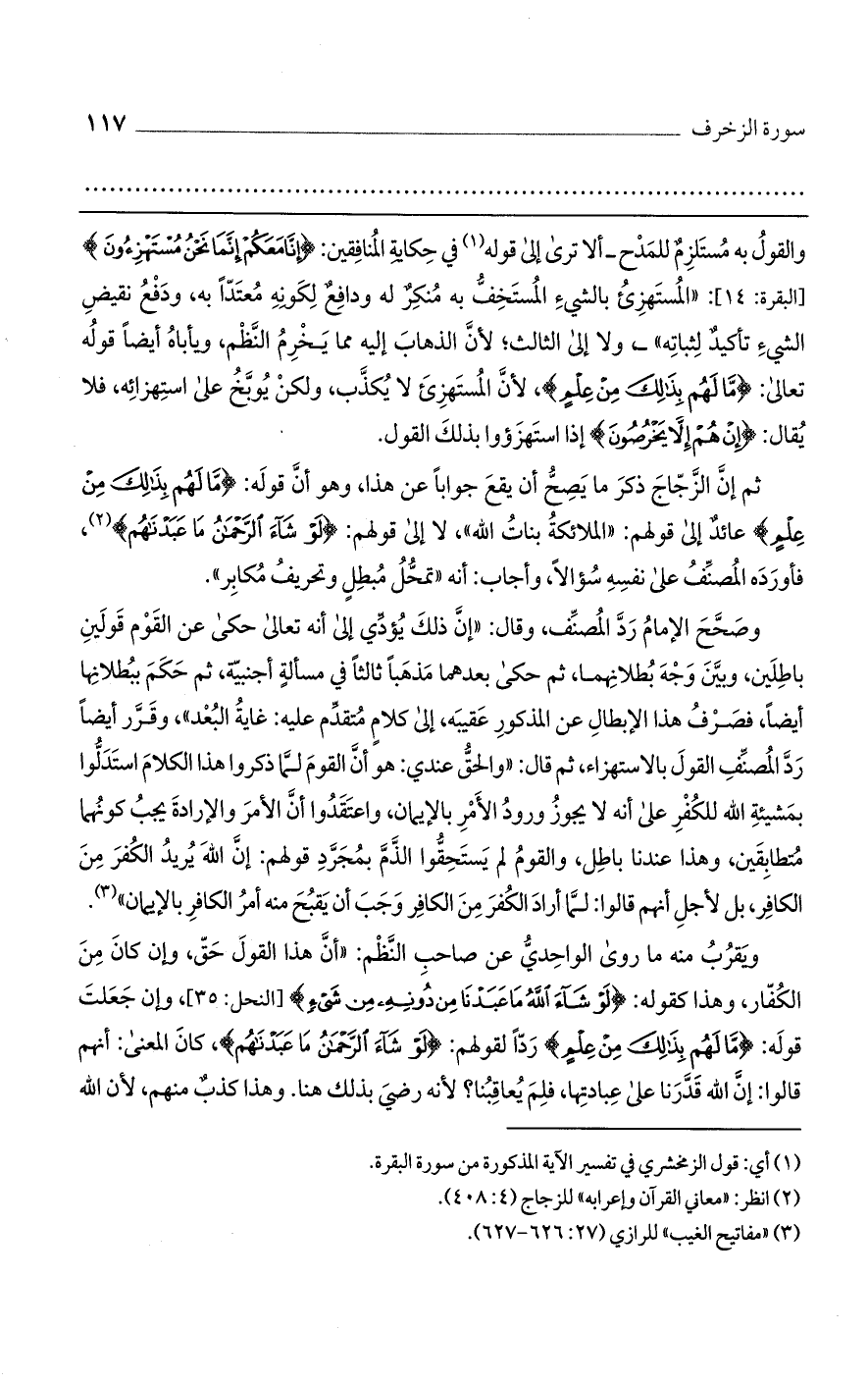 وصحح الإمام رد المصنف، وقال: "إن ذلك يؤدي إلى أنه تعالى حكى عن القوم قولين باطلين، وبين وجه بطلانهما، ثم حكى بعدهما مذهبًا ثالثًا في مسألة أجنبية، ثم حكم ببطلانها أيضًا، فصرف هذا الإبطال عن المذكور عقيبه، إلى كلام متقدم عليه: غاية البعد"، وقرر أيضًا رد المصنف القول بالاستهزاء، ثم قال: "والحق عندي: هو أن القوم لما ذكروا هذا الكلام استدلوا بمشيئة الله للكفر على أنه لا يجوز ورود الأمر بالإيمان، واعتقدوا أن الأمر والإرادة يجب كونهما متطابقين، وهذا عندنا باطل، والقوم لم يستحقوا الذم بمجرد قولهم: أن الله يريد الكفر من الكافر، بل لأجل أنهم قالوا: لما أراد الكفر من الكافر وجب أن يقبح منه أمر الكافر بالإيمان".
