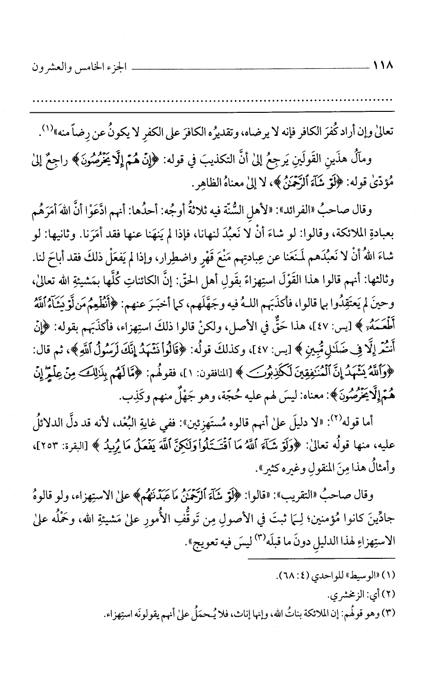 وقال صاحب "الفرائد": "لأهل السنة فيه ثلاثة أوجه: أحدها: أنهم ادعوا أن الله أمره بعبادة الملائكة، وقالوا: لو شاء أن لا نعبد لنهانا، فإذا لم ينهنا عنها فقد أمرنا. وثانيها: لو شاء الله أن لا نعبدهم لمنعنا عن عبادتهم منع قهر واضطرار، وإذا لم يفعل ذلك فقد أباح لنا. وثالثها: أنهم قالوا هذا القول استهزاءً بقول أهل الحق: أن الكائنات كلها بمشيئة الله تعالى، وحين لم يعتقدوا بما قالوا، فأكذبهم الله فيه وجهلهم، كما أخبر عنهم: {أَنُطْعِمُ مَنْ لَوْ يَشَاءُ اللَّهُ أَطْعَمَهُ} [يس: 47]، هذا حق في الأصل، ولكن قالوا ذلك استهزاء، فأكذبهم بقوله: {إِنْ أَنْتُمْ إِلَّا فِي ضَلَالٍ مُبِينٍ} [يس: 47]، وكذلك قوله: {قَالُوا نَشْهَدُ إِنَّكَ لَرَسُولُ اللَّهِ}، ثم قال: {وَاللَّهُ يَشْهَدُ إِنَّ الْمُنَافِقِينَ لَكَاذِبُونَ} [المنافقون: 1]، فقولهم: {مَّا لَهُم بِذَلِكَ مِنْ عِلْمٍ إنْ هُمْ إلاَّ يَخْرُصُونَ}: معناه: ليس لهم عليه حجة، وهو جهل منهم وكذب.