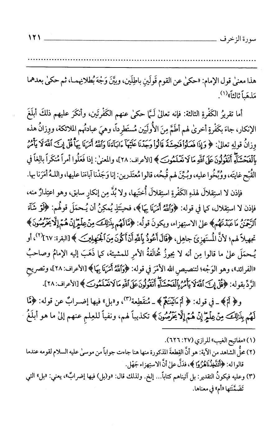 أما تقرير الكفرة الثالثة: فإنه تعالى لما حكى عنهم الكفرتين، وأنكر عليهم ذلك أبلغ الإنكار، جاء بكفرة أخرى لهم أطم من الأوليين مستطردًا، وهي عبادتهم الملائكة، ووزان هذه وزان قوله تعالى: {وَإِذَا فَعَلُوا فَاحِشَةً قَالُوا وَجَدْنَا عَلَيْهَا آَبَاءَنَا وَاللَّهُ أَمَرَنَا بِهَا قُلْ إِنَّ اللَّهَ لَا يَامُرُ بِالْفَحْشَاءِ أَتَقُولُونَ عَلَى اللَّهِ مَا لَا تَعْلَمُونَ} [الأعراف: 28]، والمعنى: إذا فعلوا أمرًا منكرًا بالغًا في القبح غايته، ووبخوا عليه، وبين لهم قبحه، قالوا معتذرين: إنا وجدنا آباءنا عليها، والله أمرنا بها.