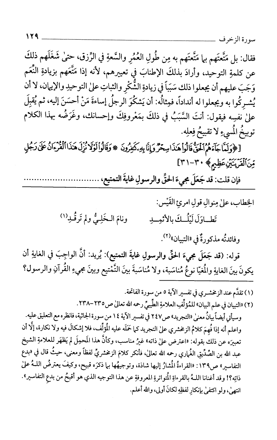فقال: بل متعتهم بما متعتهم به من طول العمر والسعة في الرزق، حتى شغلهم ذلك عن كلمة التوحيد، وأراد بذلك الإطناب في تعييرهم، لأنه إذا متعهم بزيادة النعم وجب عليهم أن يجعلوا ذلك سببًا في زيادة الشكر والثبات على التوحيد والإيمان، لا أن يشركوا به ويجعلوا له أندادًا، فمثاله: أن يشكو الرجل إساءة من أحسن إليه، ثم يقبل على نفسه فيقول: أنت السبب في ذلك بمعروفك وإحسانك، وغرضه بهذا الكلام توبيخ المسيء لا تقبيح فعله.