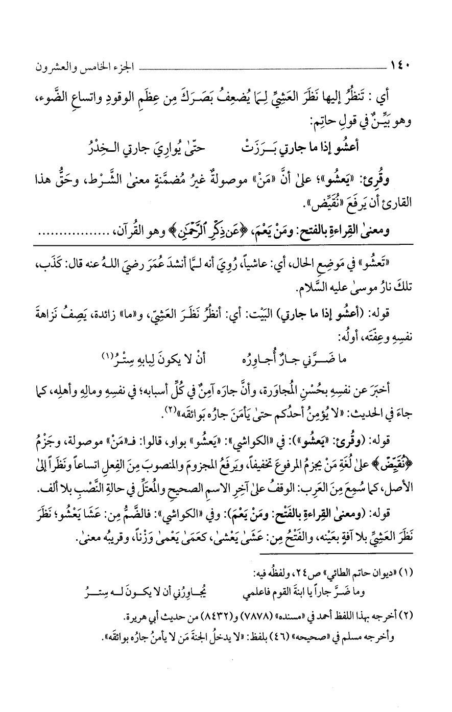 قوله: (ومعنى القراءة بالفتح: ومن يعم): وفي "الكواشي": فالضم من: عشا يعشو؛ نظر نظر العشي بلا آفة بعينه، والفتح من: عشى يعشى، كعمى يعمى وزنًا، وقريبه معنى.