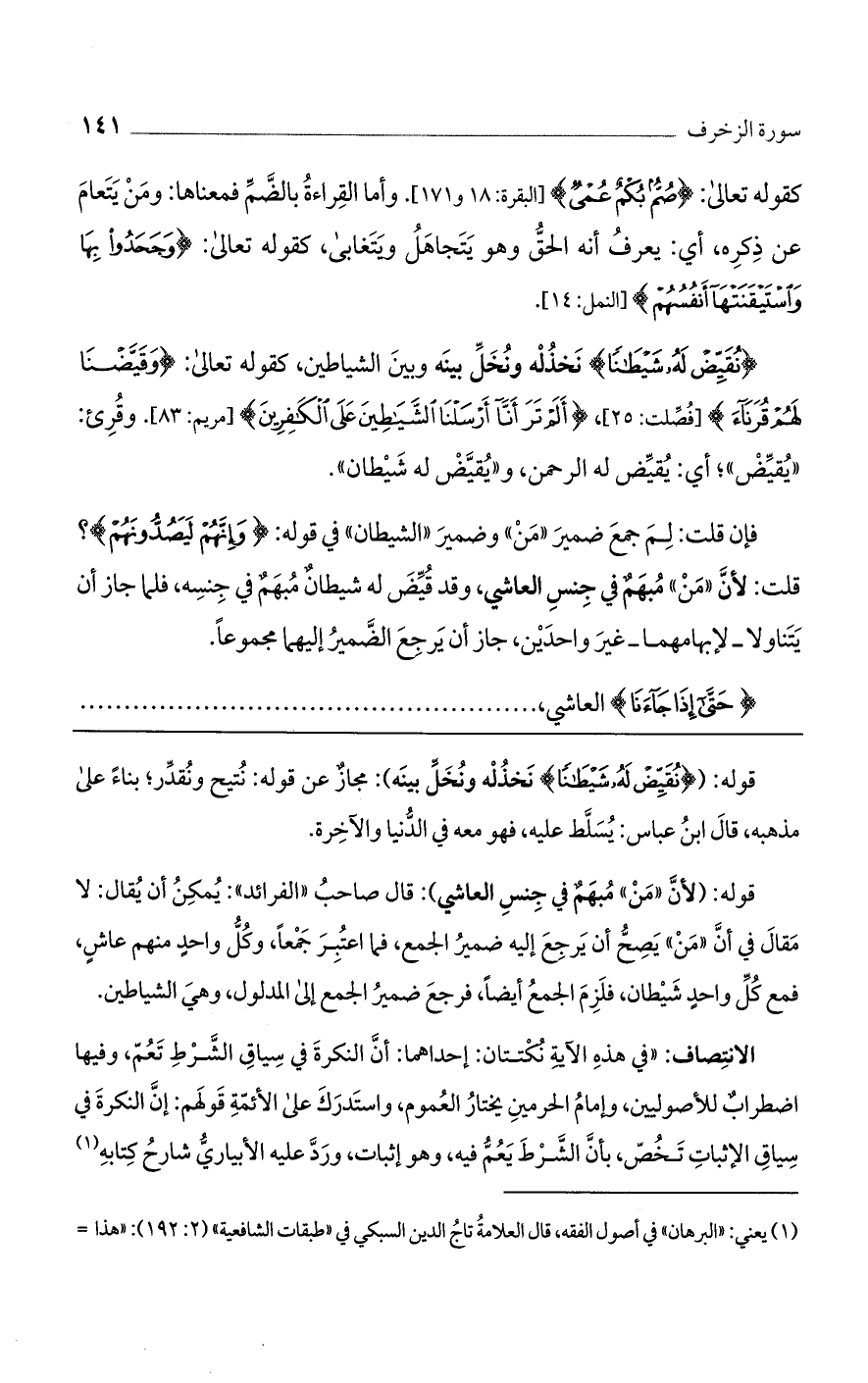 فإن قلت: لم جمع ضمير "من" وضمير "الشيطان" في قوله: {وَإِنَّهُمْ لَيَصُدُّونَهُمْ}؟ قلت: لأنّ "مَنْ" مبهم في جنس العاشي، وقد قيض له شيطان مبهم في جنسه، فلما جاز أن يتناولا -لإبهامهما- غير واحدين، جاز أن يرجع الضمير إليهما مجموعًا.