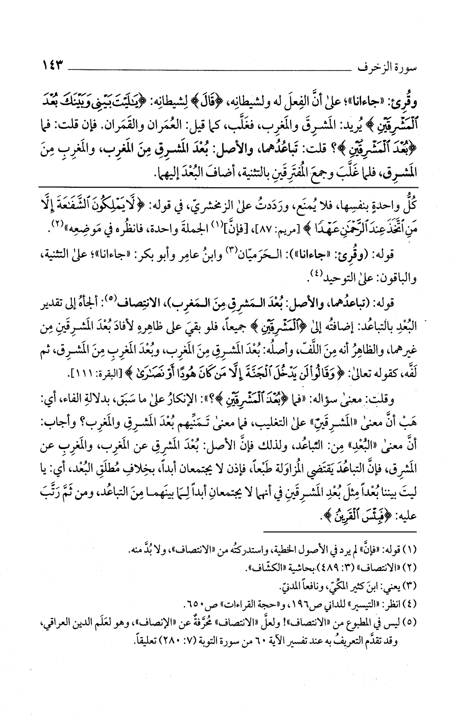 وقرئ: "جاءانا"، على أنّ الفعل له ولشيطانه، {قالَ} لشيطانه: {يا لَيْتَ بَيْنِي وَبَيْنَكَ بُعْدَ الْمَشْرِقَيْنِ} يريد: المشرق والمغرب، فغلب، كما قيل: العمران والقمران. فإن قلت: فما {بُعْدَ المَشْرِقَيْنِ}؟ قلت: تباعدهما، والأصل: بعد المشرق من المغرب، والمغرب من المشرق، فلما غلب وجمع المفترقين بالتثنية، أضاف البعد إليهما.