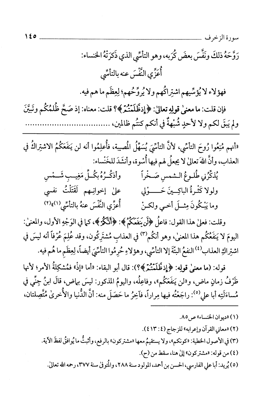 وقلت: فعلى هذا القول: فاعل {لَن يَنفَعَكُمُ}: {أَنَّكُمْ}، كما في الوجه الأول، والمعنى: اليوم لا ينفعكم هذا المعنى، وهو أنكم في العذاب مشتركون، وقد علم عرفًا أنه ليس في اشتراك العذاب النفع البتة إلا التأسي، وهؤلاء حرموا التأسي أيضًا، لعظم ما هم فيه.