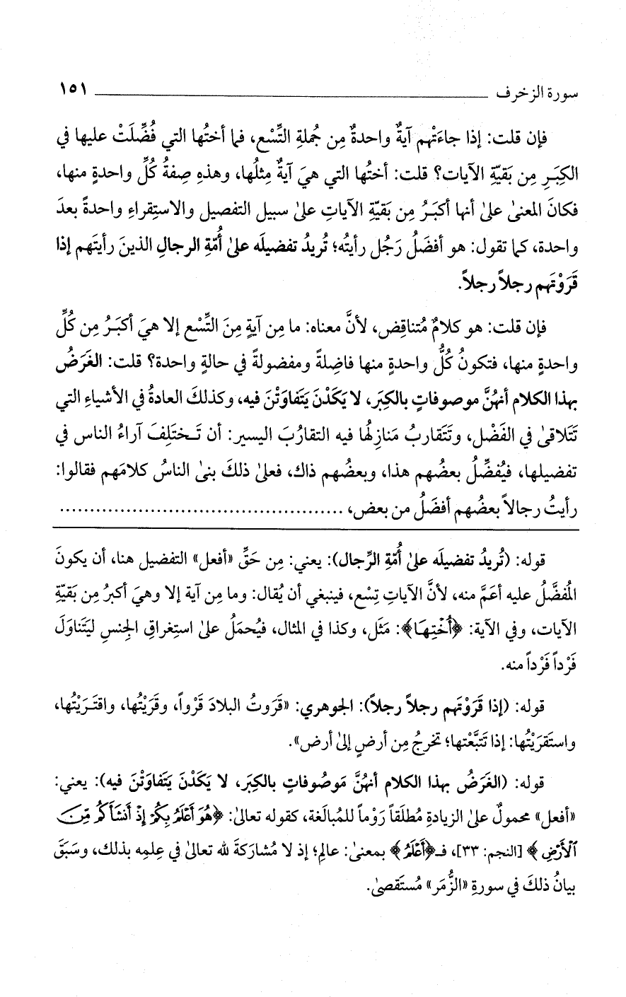 فإن قلت: هو كلام متناقض، لأنّ معناه: ما من آية من التسع إلا هي أكبر من كل واحدة منها، فتكون واحدة منها فاضلة ومفضولة في حالة واحدة؟ قلت: الغرض بهذا الكلام أنهنّ موصوفات بالكبر، لا يكدن يتفاوتن فيه، وكذلك العادة في الأشياء التي تتلاقى في الفضل، وتتقارت منازلها فيه التقارت اليسير: أن تختلف آراء الناس في تفضيلها، فيفضل بعضهم هذا، وبعضهم ذاك، فعلى ذلك بنى الناس كلامهم فقالوا: رأيت رجالًا بعضهم أفضل من بعض،