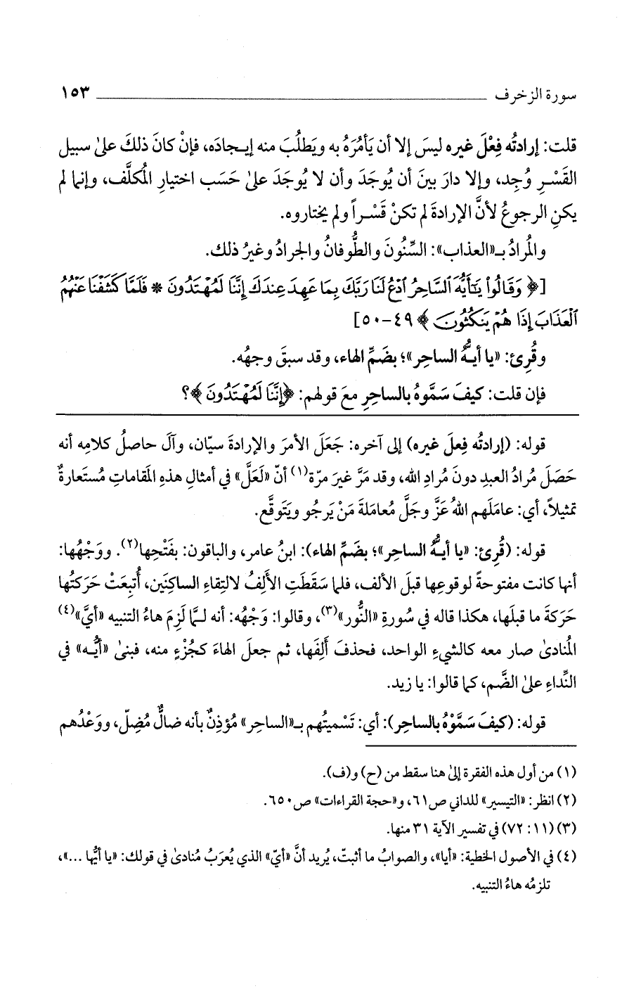 قوله: (قرئ: "يا أيه الساحر"؛ بضم الهاء): ابن عامر، والباقون: بفتحها. ووجهها: أنها كانت مفتوحة لوقوعها قبل الألف، فلما سقطت الألف لالتقاء الساكنين، أتبعت حركتها حركة ما قبلها، هكذا قاله في سورة "النور"، وقالوا: وجهه: أنه لما لزم هاء التنبيه "أي" المنادى صار معه كالشيء الواحد، فحذف ألفها، ثم جعل الهاء كجزء منه، فبنى "أيه" في النداء على الضم، كما قالوا: يا زيد.