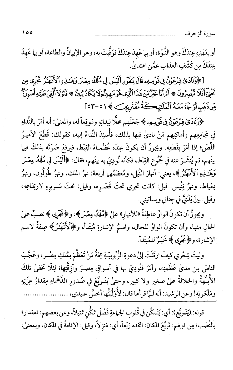 {وَنادى فِرْعَوْنُ فِي قَوْمِهِ} جعلهم محلا لندائه وموقعًا له، والمعنى: أنه أمر بالنداء في مجامعهم وأما كنهم من نادى فيها بذلك، فأسند النداء إليه، كقولك: قطع الأمير اللص؛ إذا أمر بقطعه. ويجوز أن يكون عنده عظماء القبط، فيرفع صوته بذلك فيما بينهم، ثم ينشر عنه في جموع القبط، فكأنه نودي به بينهم، فقال: {أَلَيْسَ لِي مُلْكُ مِصْرَ وَهذِهِ الْأَنْهارُ} يعني أنهار النيل، ومعظمهما أربعة: نهر الملك، ونهر طولون، ونهر دمياط، ونهر تنيس. قيل: كانت تجري تحت قصره، وقيل: تحت سريره لارتفاعه، وقيل: بين يدي في جناني وبساتيني.