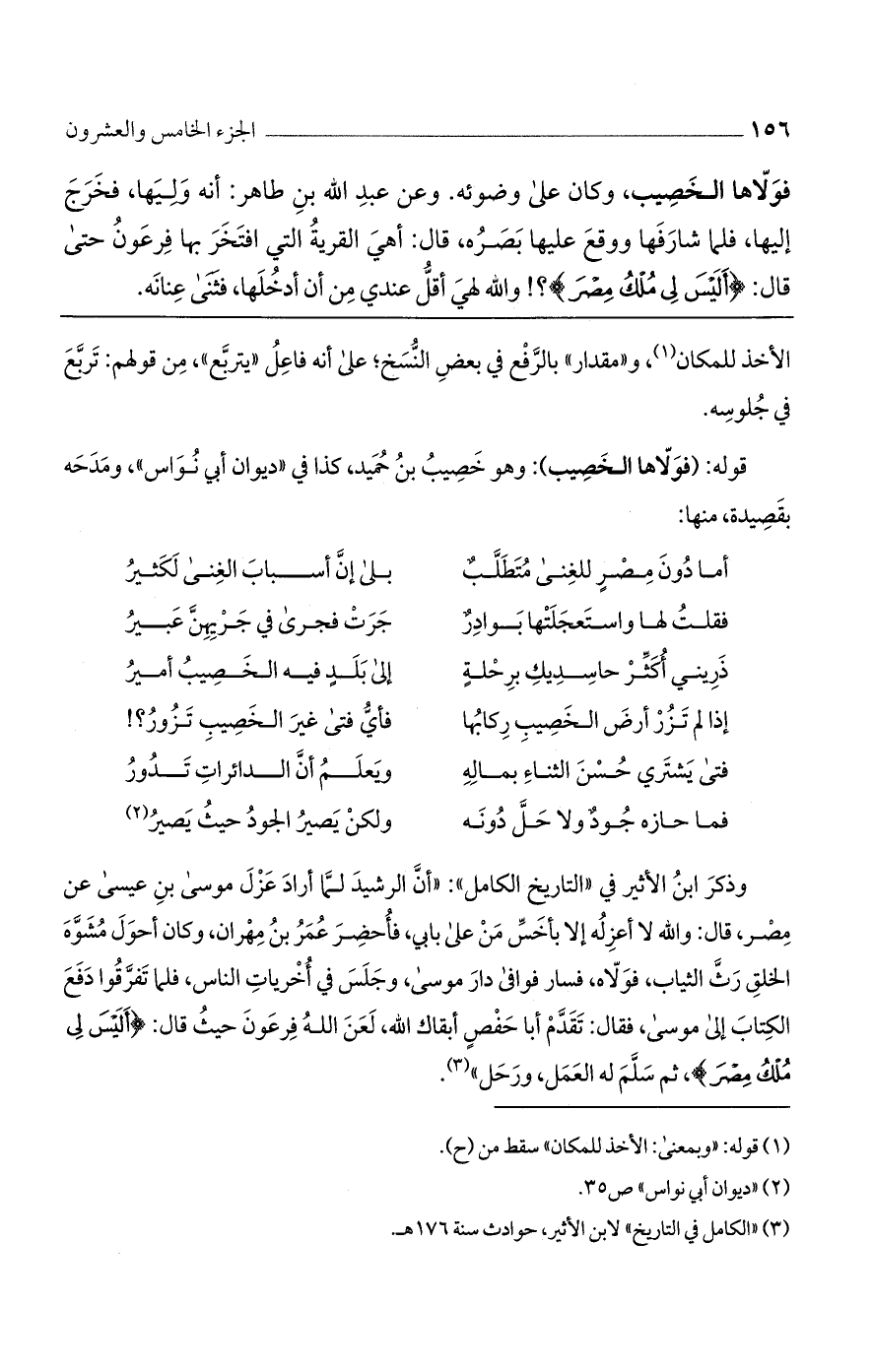 فولاها الخصيب، وكان على وضوئه. وعن عبد الله بن طاهر: أنه وليها، فخرج إليها، فلما شارفها ووقع عليها بصره، قال: أهي القرية التي افتخر بها فرعون حتى قال: {أَلَيْسَ لِي مُلْكُ مِصْرَ}؟ ! والله لهي أقل عندي من أن أدخلها، فثنى عنانه.