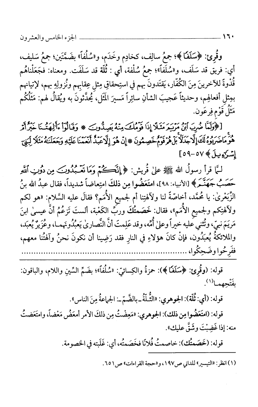 لما قرأ رسول الله صلى الله عليه وسلم على قريش: {إِنَّكُمْ وَما تَعْبُدُونَ مِنْ دُونِ اللَّهِ حَصَبُ جَهَنَّمَ} [الأنبياء: 98]، امتعضوا من ذلك امتعاضًا شديدًا، فقال عبد الله بن الزبعرى: يا محمد، أخاصة لنا ولآلهتنا أم لجميع الأمم؟ فقال عليه السلام: "هو لكم ولآلهتكم ولجميع الأمم"، فقال: خصمتك ورب الكعبة، ألست تزعم أنّ عيسى ابن مريم نبيّ، وتثني عليه خيرًا وعلى أمه، وقد علمت أنّ النصارى يعبدونهما، وعزير يعبد، والملائكة يعبدون، فإن كان هؤلاء في النار فقد رضينا أن نكون نحن وآلهتنا معهم، ففرحوا وضحكوا،
