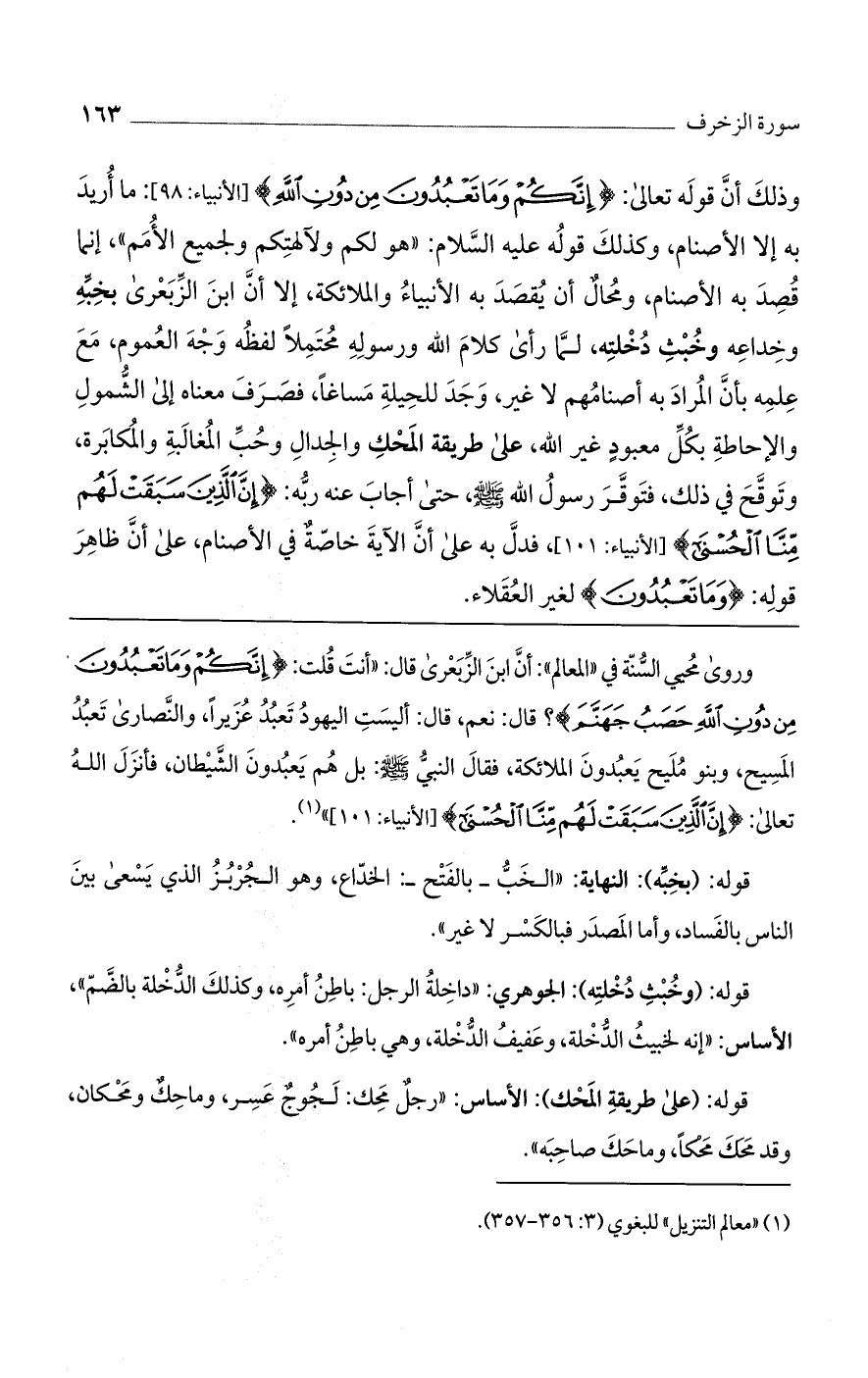 وروى محيي السنة في"المعالم": أن ابن الزبعرى قال: "أنت قلت: {إِنَّكُمْ وَمَا تَعْبُدُونَ مِنْ دُونِ اللَّهِ حَصَبُ جَهَنَّمَ}؟ قال: نعم، قال: أليست اليهود تعبد عزيزًا، والنصارى تعبد المسيح، وبنو مليح يعبدون الملائكة، فقال النبي صلى الله عليه وسلم: بل هم يعبدون الشيطان، فأنزل الله تعالى: {إِنَّ الَّذِينَ سَبَقَتْ لَهُمْ مِنَّا الْحُسْنَى} [الأنبياء: 101] ".
