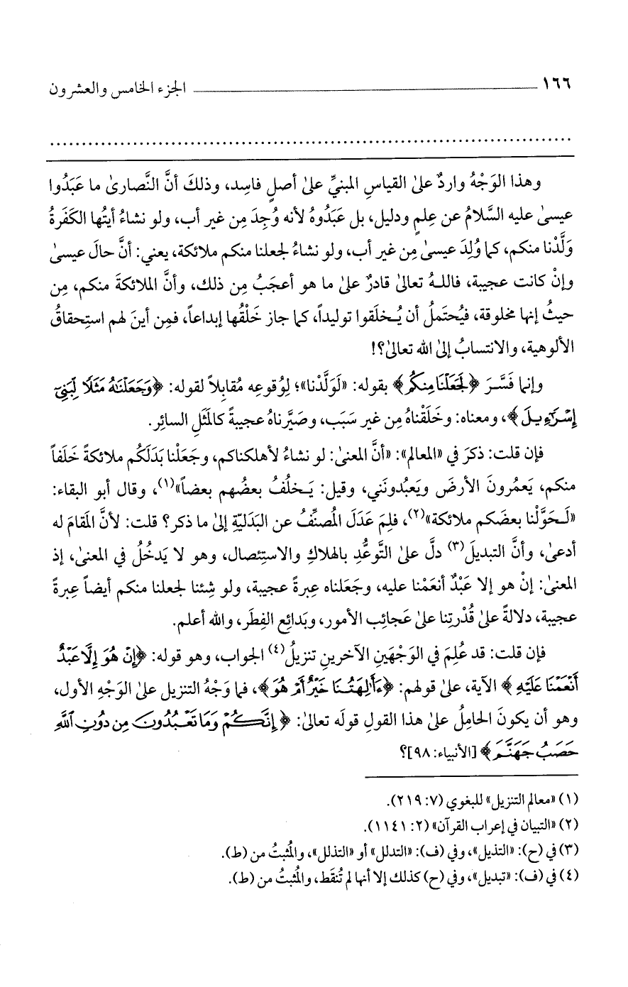 وهذا الوجه وارد على القياس المبني على أصل فاسد، وذلك أن النصارى ما عبدوا عيسى عليه السلام عن علم ودليل، بل عبدوه لأنه وجد من غير أب، ولو نشاء أيتها الكفرة ولدنا منكم، كما ولد عيسى من غير أب، ولو نشاء لجعلنا منكم ملائكة، يعني: أن حال عيسى وإن كانت عجيبة، فالله تعالى قادر على ما هو أعجب من ذلك، وأن الملائكة منكم، من حيث إنها مخلوقة، فيحتمل أن يخلقوا توليدًا، كما جاز خلقها إبداعًا، فمن أين لهم استحقاق الألوهية، والانتساب إلى الله تعالى؟ !