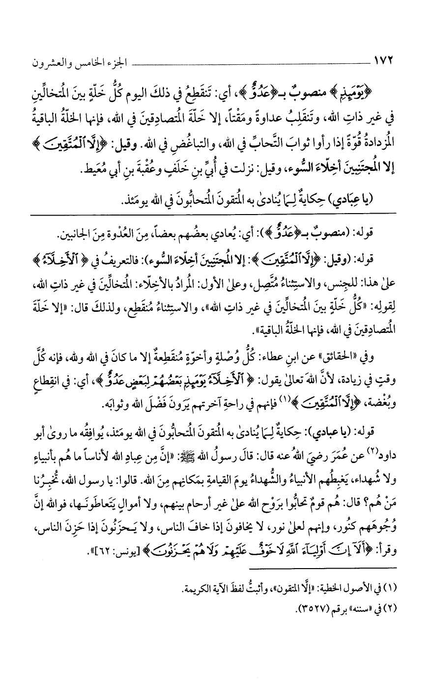 قوله: (وقيل: {إِلَّا الْمُتَّقِينَ}: إلا المجتنبين أخلاء السوء): فالتعريف في {الْأَخِلَّاءُ} على هذا: للجنس، والاستثناء متصل، وعلى الأول: المراد بالأخلاء: المتخالين في غير ذات الله، لقوله: "كل خلة بين المتخالين في غير ذات الله"، والاستثناء منقطع، ولذلك قال: "إلا خلة المتصادقين في الله، فإنها الخلة الباقية".