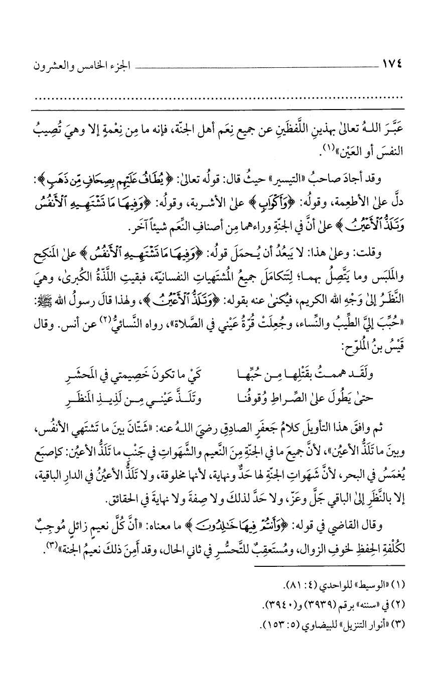 وقلت: وعلى هذا: لا يبعد أن يحمل قوله: {وفِيهَا مَا تَشْتَهِيهِ الأَنفُسُ} على المنكح والملبس وما يتصل بهما؛ لتتكامل جميع المشتهيات النفسانية، فبقيت اللذة الكبرى، وهي النظر إلى وجه الله الكريم، فيكنى عنه بقوله: {وتَلَذُّ الأَعْيُنُ}، ولهذا قال رسول الله صلى الله عليه وسلم: "حبب إلى الطيب والنساء، وجعلت قرة عيني في الصلاة"، رواه النسائي عن أنس. وقال قيس بن الملوح: