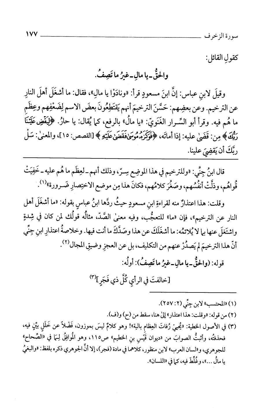 وقلت: هذا اعتذار منه لقراءة ابن مسعود حيث ردها ابن عباس بقوله: "ما أشغل أهل النار عن الترخيم"، فإن "ما" للتعجب، وفيه معنى الصد، مثاله قولك لمن كان في شدة واشتغل عنها بما لا يلائمه: ما أشغلك عن هذا وصدك ما أنت فيها. وخلاصة اعتذار ابن جني أن هذا الترخيم لم يصدر عنهم من التكليف، بل عن العجز وضيق المجال.