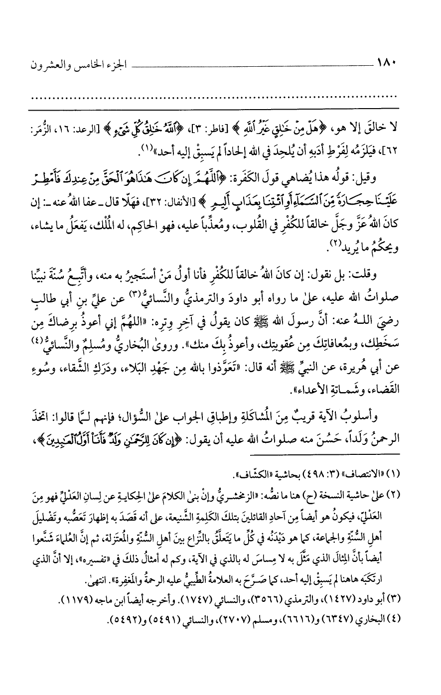 وقلت: بل نقول: أن كان الله خالقًا للكفر فأنا أول من أستجير به منه، وأتبع سنة نبينا صلوات الله عليها، على ما رواه أبو داود والترمذي والنسائي عن علي بن أبي طالب رضي الله عنه: أن الرسول الله صلى الله عليه وسلم كان يقول في آخر وتره: "اللهم إني أعوذ برضاك من سخطك، وبمعافاتك من عقوبتك، وأعوذ بك منك". وروى البخاري ومسلم والنسائي عن أبي هريرة، عن النبي صلى الله عليه وسلم أنه قال: "تعوذوا بالله من جهد البلاء، ودرك الشقاء، وسوء القضاء، وشماتة الأعداء".