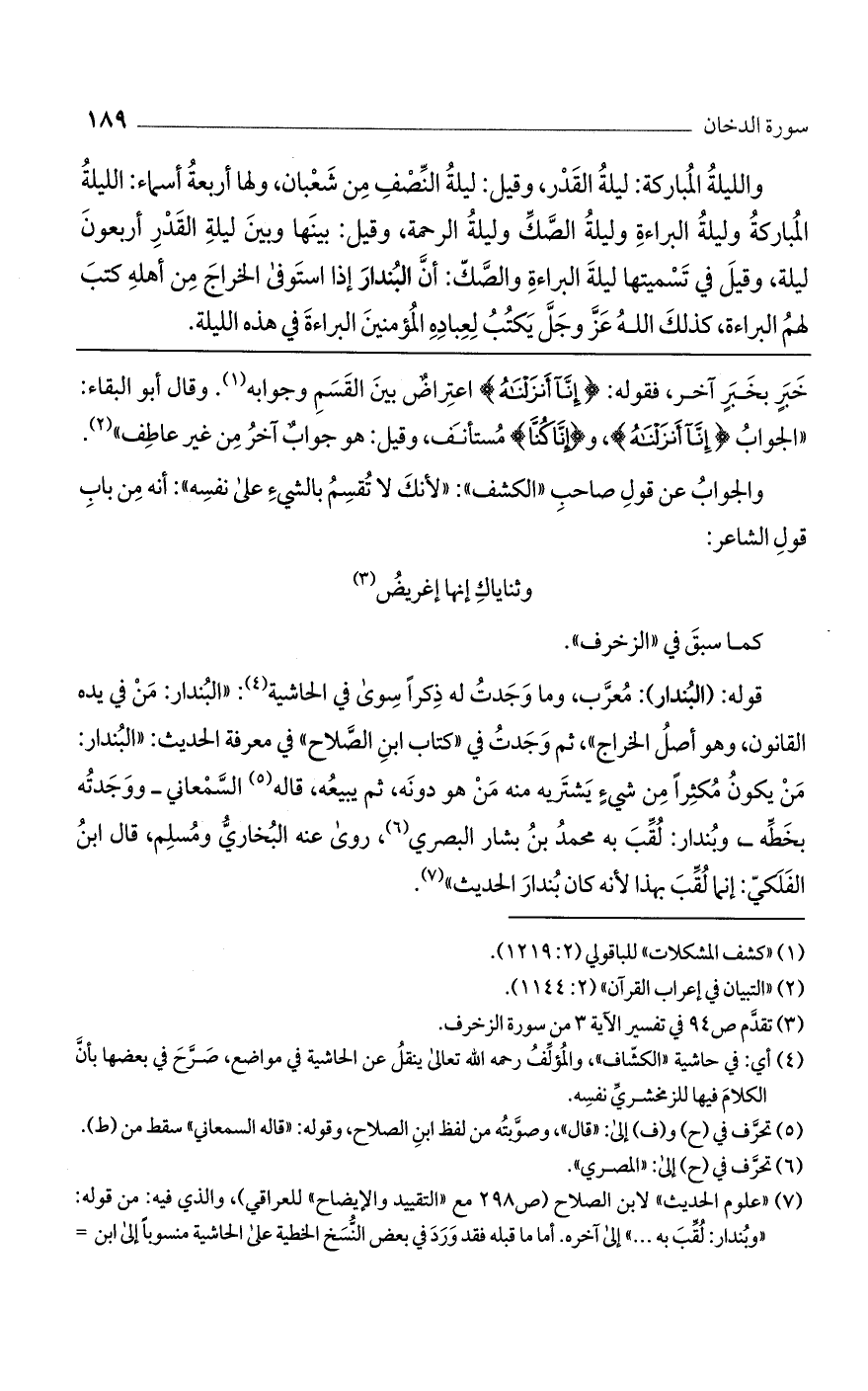 والليلة المباركة: ليلة القدر، وقيل: ليلة النصف من شعبان، ولها أربعة أسماء: الليلة المباركة، وليلة البراءة، وليلة الصكّ، وليلة الرحمة، وقيل: بينها وبين ليلة القدر أربعون ليلة، وقيل في تسميتها: ليلة البراءة والصكّ: أن البندار إذا استوفى الخراج من أهله كتب لهم البراءة، كذلك الله عز وجل يكتب لعباده المؤمنين البراءة في هذه الليلة.