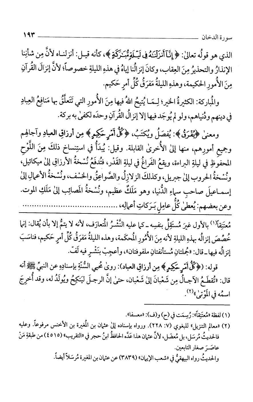 قوله: {كُلُّ أَمْرٍ حَكِيمٍ} من أرزاق العباد): روى محيي السنة بإسناده عن النبي صلى الله عليه وسلم أنه قال: "تقطع الآجال من شعبان إلى شعبان، حتى أن الرجل لينكح ويولد له، وقد أخرج اسمه في الموتى".