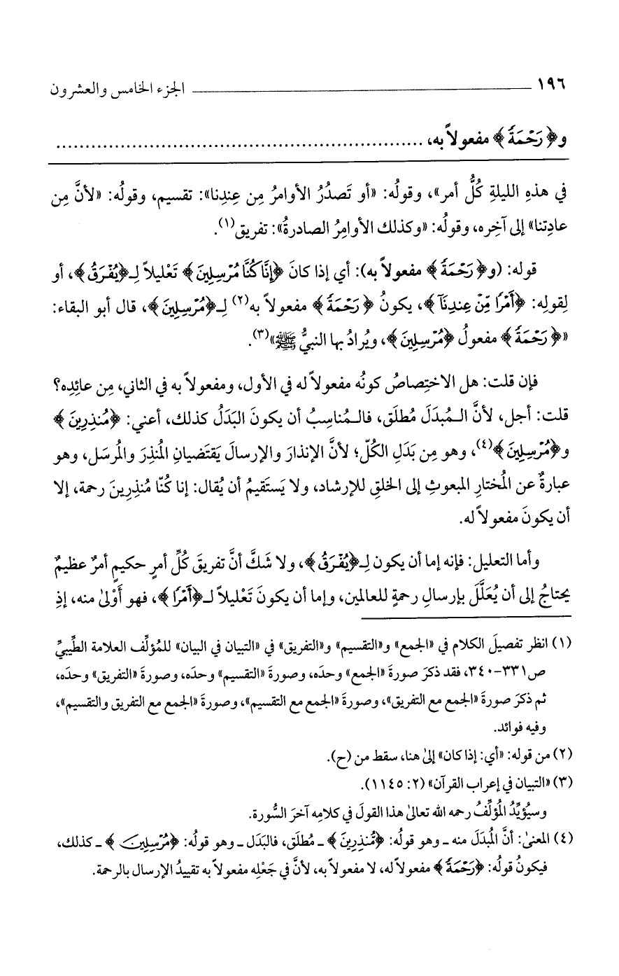وأما التعليل: فإنه إما أن يكون لـ {يُفْرَقُ}، ولا شك أن تفريق كل أمر حكيم أمر عظيم يحتاج إلى أن يعلل بإرسال رحمة للعالمين، وإما أن يكون تعليلًا لـ {أَمْرًا}، فهو أولى منه، إذ