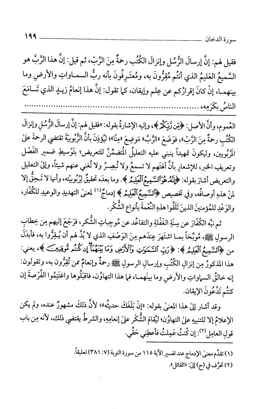 العموم، وأن الأصل: {مِنء رَبِّكُمْ}، وإليه الإشارة بقوله: "فقيل لهم: أن إرسال الرسل وإنزال الكتب رحمة من الرب"، فوضع "الرب" موضع "منا"؛ ليؤذن بأن الربوبية تقتضي الرحمة على المربين، وليكون تمهيدًا ينبني عليه التعليل المتضمن للتعريض؛ بتوسيط ضمير الفصل وتعريف الخبر، للإشعار بأن آلهتهم لا تسمع ولا تبصر ولا تغني عنهم شيئًا، وإلى التعليل والتعريض أشار بقوله: {إنَّهُ هُوَ السَّمِيعُ الْعَلِيمُ}. وما بعده تحقيق لربوبيته، وأنها لا تحق إلا لمن هذه أوصافه، وفي تخصيص {السَّمِيعُ الْعَلِيمُ} إدماج لمعنى التهديد والوعيد للكفار، والوعد للمؤمنين الذين تلقوا هذه النعمة بأنواع الشكر.