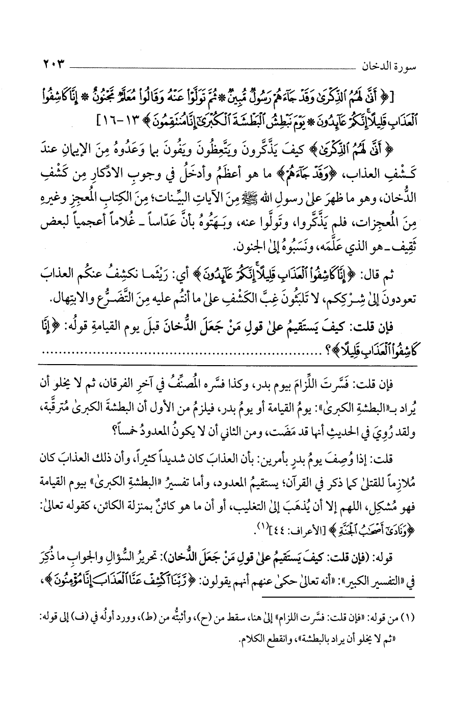 قلت: إذا وصف يوم بدر بأمرين: بأن العذاب كان شديدًا كثيرًا، وأن ذلك العذاب كان ملازمًا للقتلى كما ذكر في القرآن؛ يستقيم المعدود، وأما تفسير "البطشة الكبرى" بيوم القيامة فهو مشكل، اللهم إلا أن يذهب إلى التغليب، أو أن ما هو كائن بمنزلة الكائن، كقوله تعالى: {وَنَادَى أَصْحَابُ الْجَنَّةِ} [الأعراف: 44].