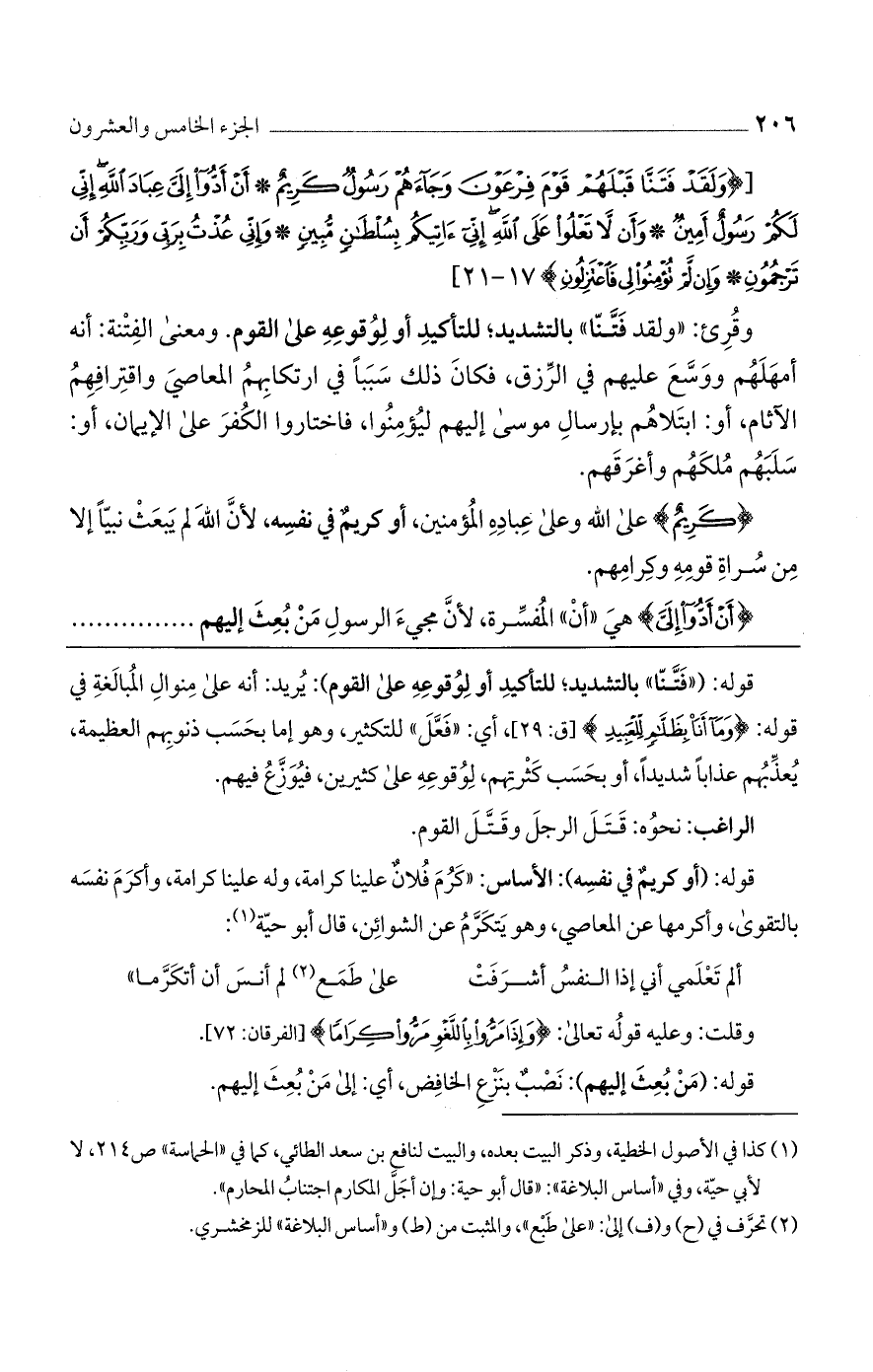 [{وَلَقَدْ فَتَنَّا قَبْلَهُمْ قَوْمَ فِرْعَوْنَ وَجاءَهُمْ رَسُولٌ كَرِيمٌ * أَنْ أَدُّوا إِلَيَّ عِبادَ اللَّهِ إِنِّي لَكُمْ رَسُولٌ أَمِينٌ * وَأَنْ لا تَعْلُوا عَلَى اللَّهِ إِنِّي آتِيكُمْ بِسُلْطانٍ مُبِينٍ * وَإِنِّي عُذْتُ بِرَبِّي وَرَبِّكُمْ أَنْ تَرْجُمُونِ * وَإِنْ لَمْ تُؤْمِنُوا لِي فَاعْتَزِلُونِ} 17 - 21]