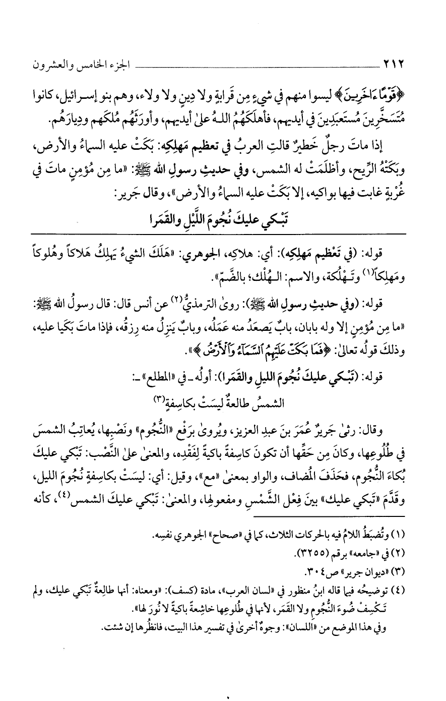 وقال: رثى جرير عمر بن عبد العزيز، ويروى برفع "النجوم" ونصبها، يعاتب الشمس في طلوعها، وكان من حقها أن يكون كاسفةً باكيةً لفقده، والمعنى على النصب: تبكي عليك بكاء النجوم، فحذف المضاف، والواو بمعنى "مع"، وقيل: أي: ليست بكاسفة نجوم الليل، وقدم "تبكي عليك" بين فعل الشمس ومفعولها، والمعنى: تبكي عليك الشمس، كأنه