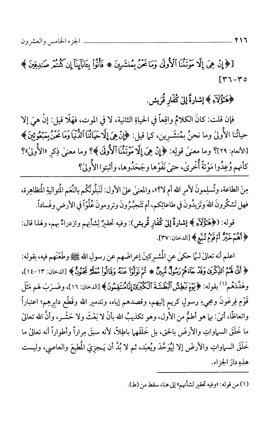 فإن قلت: كان الكلام واقعًا في الحياة الثانية، لا في الموت، فهلا قيل: إن هي إلا حياتنا الأولى وما نحن بمنشرين، كما قيل: {إِنْ هِيَ إِلَّا حَيَاتُنَا الدُّنْيَا وَمَا نَحْنُ بِمَبْعُوثِينَ} [الأنعام: 29]؟ وما معنى قوله: {إِنْ هِيَ إِلَّا مَوْتَتُنَا الْأُولى}؟ وما معنى ذكر "الأولى"؟ كأنهم وعدوا موتة أخرى، حتى نفوها وجحدوها، وأثبتوا الأولى؟