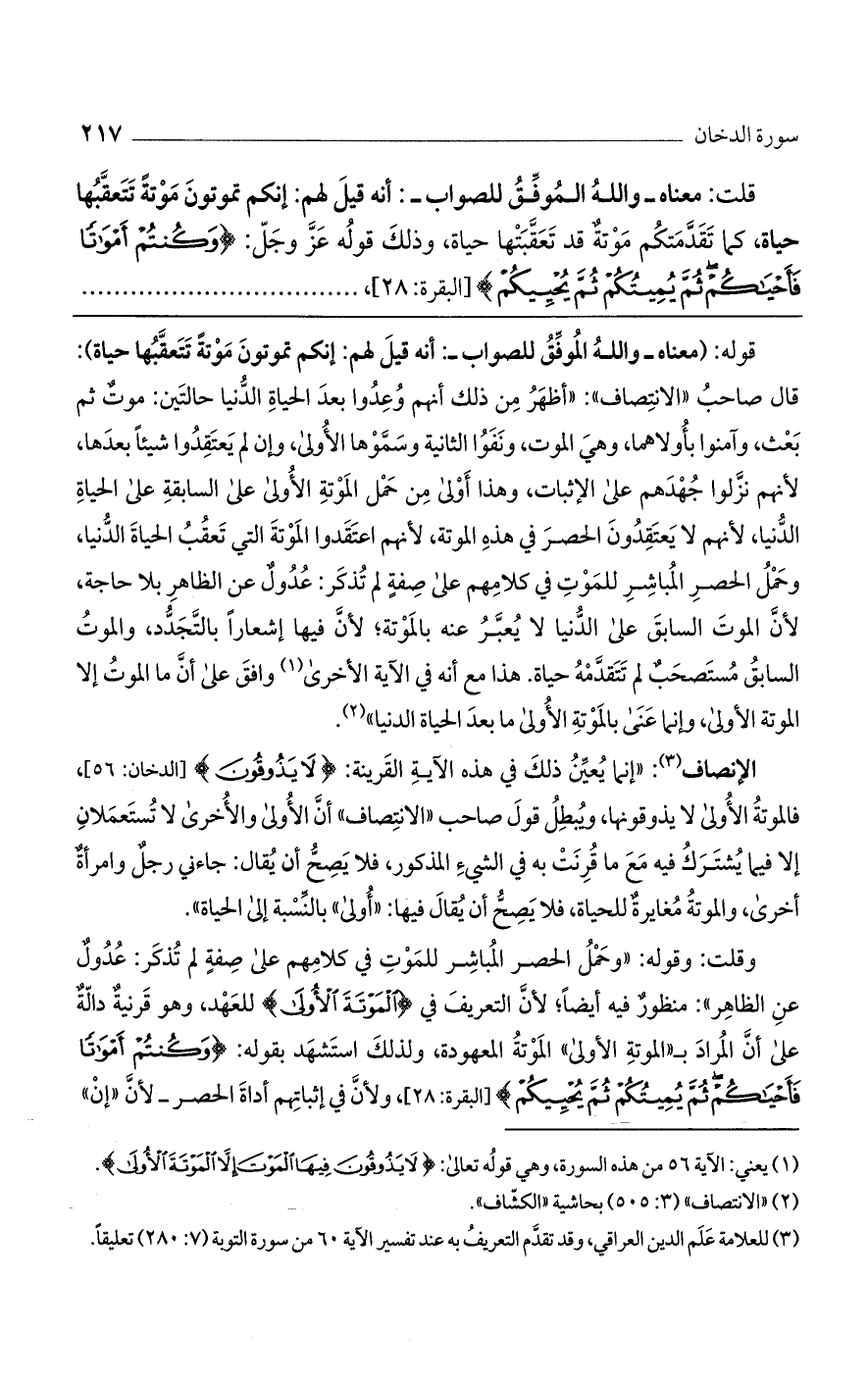 وقلت: وقوله: "وحمل الحصر المباشر للموت في كلامهم على صفة لم تذكر: عدول عن الظاهر": منظور فيه أيضًا؛ لأن التعريف في {المَوْتَةَ الأُولَى} للعهد، وهو قرنية دالة على أن المراد بـ"الموتة الأولى" الموتة المعهودة، ولذلك استشهد بقوله: {وَكُنْتُمْ أَمْوَاتًا فَأَحْيَاكُمْ ثُمَّ يُمِيتُكُمْ ثُمَّ يُحْيِيكُمْ} [البقرة: 28]، ولأن في إثباتهم أداة الحصر- لأن "إن"