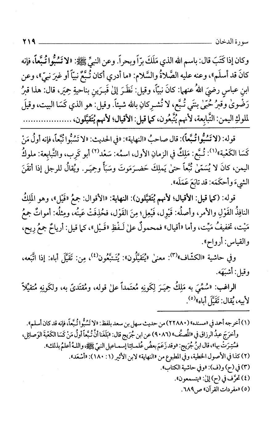 وكان إذا كتب قال: باسم الله الذي ملك برًّا وبحرًا. وعنى النبي صلى الله عليه وسلم: «لا تسبوا تبعًا، فإنه كان قد أسلم»، وعنه عليه الصلاة والسلام: «ما أدري أكان تبع نبيًا أو غير نبي»، وعن ابن عباس رضي الله عنهما: كان نبيًا، وقيل: نظر إلى قبرين بناحية حمير، قال: هذا قبر رضوى وقبر حبى بنتي تبع، لا تشركان بالله شيئًا. وقيل: هو الذي كسا البيت، وقيل لملوك اليمن: التبابعة، لأنهم يتبعون، كما قيل: الأقيال؛ لأنهم يتقيلون،