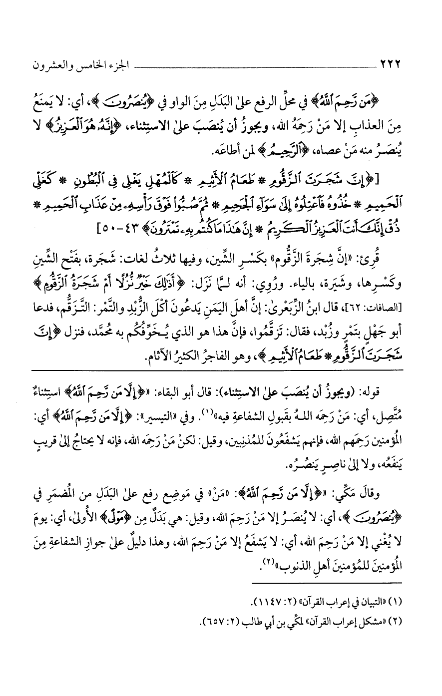 وقال مكي: " {إلاَّ مَن رَّحِمَ اللَّهُ}: "من" في موضع رفع على البدل من المضمر في {يُنْصَرُونَ}، أي: لا ينصر إلا من رحم الله، وقيل: هي بدل من {مَوْلًى} الأولى، أي: يوم لا يغني إلا من رحم الله، أي: لا يشفع إلا من رحم الله، وهذا دليل على جواز الشفاعة من المؤمنين للمؤمنين أهل الذنوب".