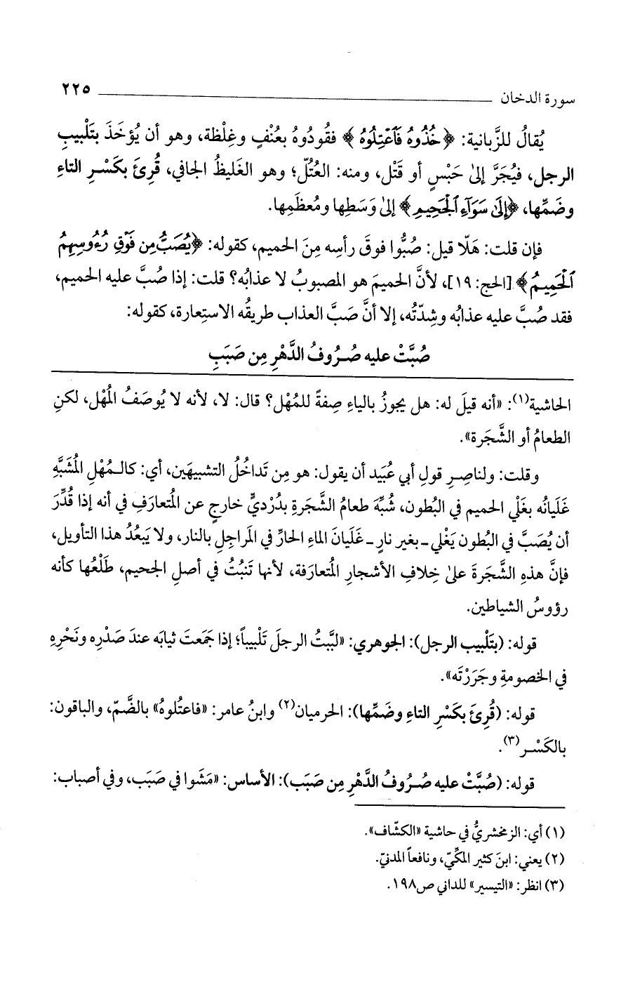 وقلت: ولناصر قول أبي عبيد أن قول: هو من تداخل التشبيهين، أي: كالمهل المشبه غليانه بغلي الحميم في البطون، شبه طعام الشجرة بدردي خارج عن المتعارف في أنه إذا قدر أن يصب في البطون يغلي- بغير نار- غليان الماء الحار في المراجل بالنار، ولا يبعد هذا التأويل، فإن هذه الشجرة على خلاف الأشجار المتعارفة، لأنها تنبت في أصل الجحيم، طلعها كأنه رؤوس الشياطين.