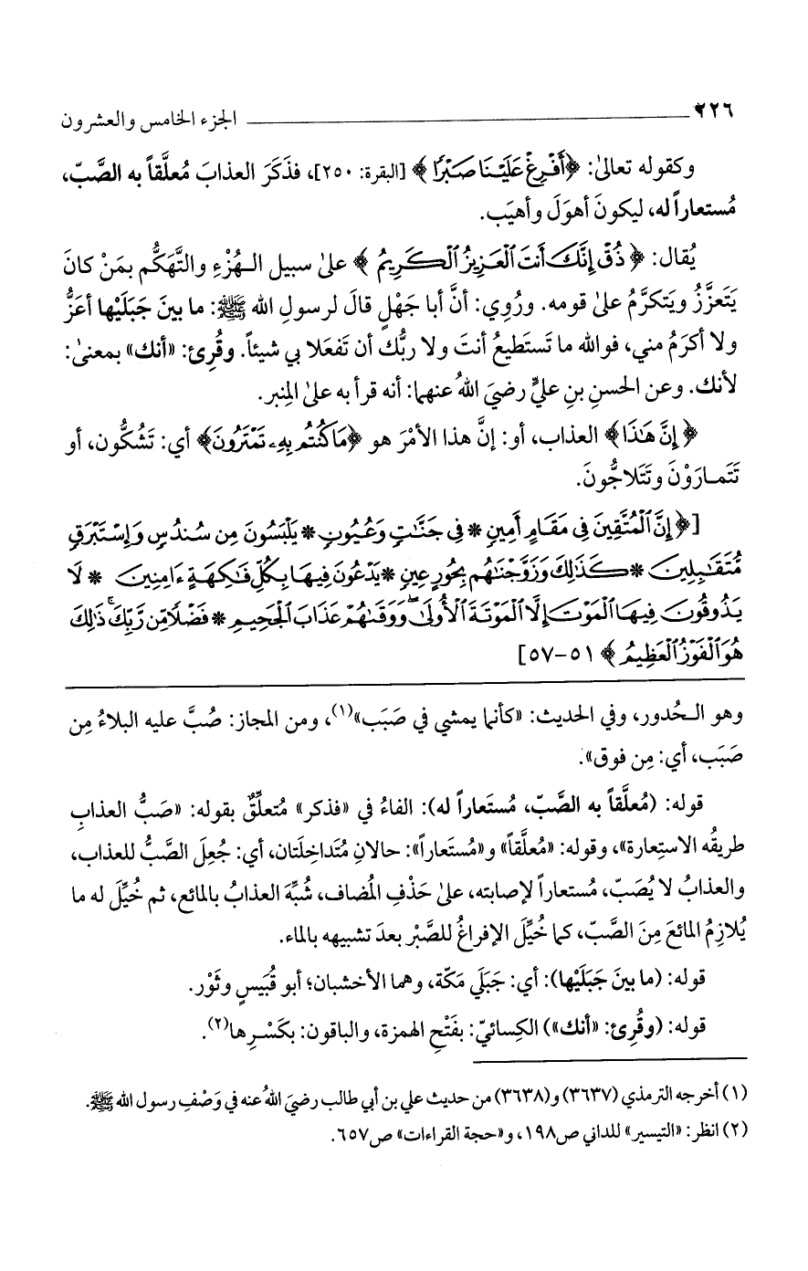 يقال: {ذُقْ إِنَّكَ أَنْتَ الْعَزِيزُ الْكَرِيمُ} على سبيل الهزؤ والتهكم بمن كان يتعزز ويتكرم على قومه. وروي: أنّ أبا جهل قال لرسول الله صلى الله عليه وسلم: ما بين جبليها أعز ولا أكرم مني، فو الله ما تستطيع أنت ولا ربك أن تفعلا بي شيئًا. وقرئ: "أنك"، بمعنى: لأنك. وعن الحسن بن علي رضي الله عنهما: أنه قرأ به على المنبر.