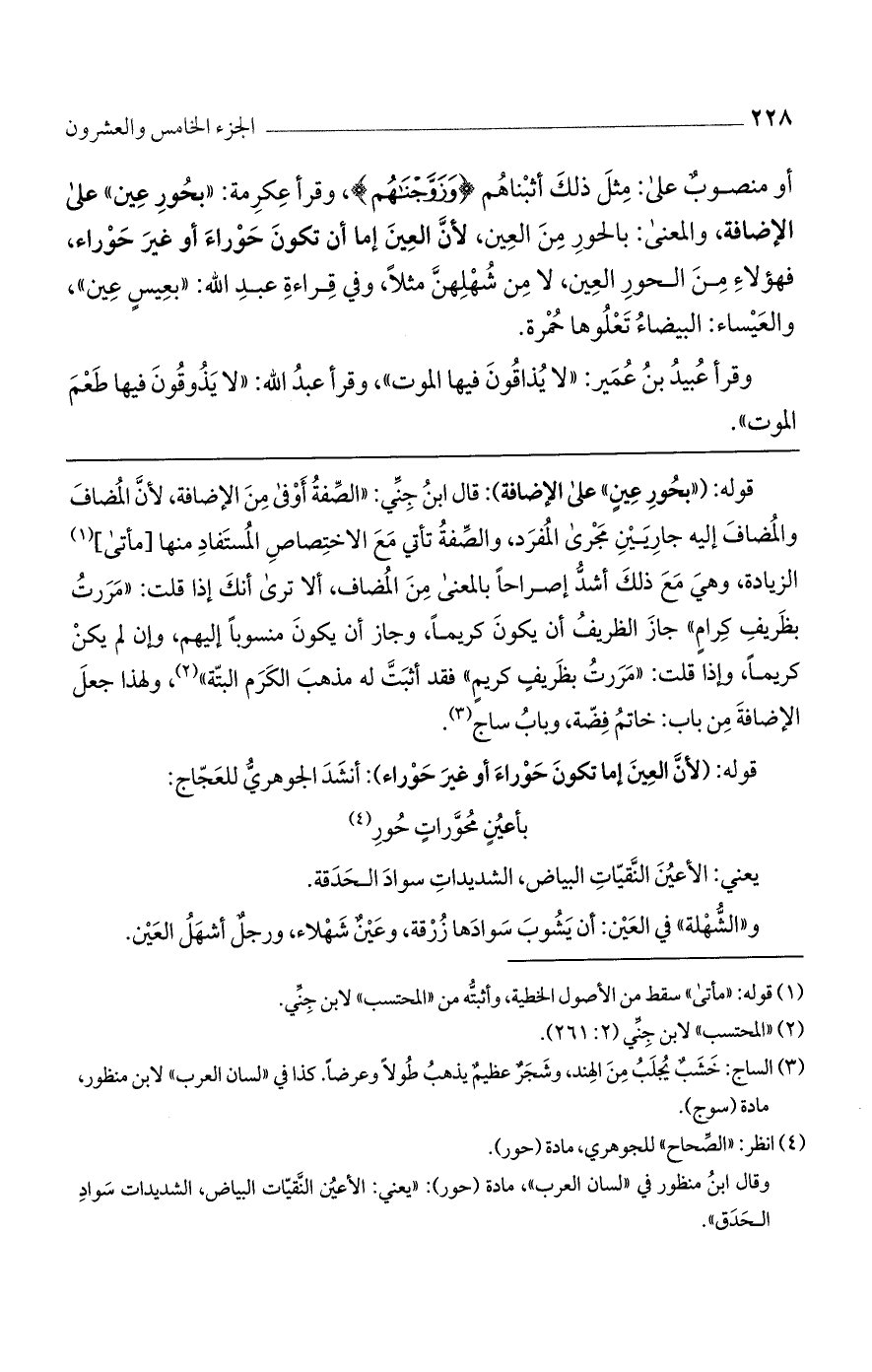 قوله: ("بحور عين" على الإضافة): قال ابن جني: "الصفة أوفى من الإضافة، لأن المضاف والمضاف إليه جاريين مجرى المفرد، والصفة تأتي مع الاختصاص المستفاد منها [مأتى] الزيادة، وهي مع ذلك أشد إصراحًا بالمعنى من المضاف، ألا ترى أنك إذا قلت: "مررت بظريف كرام" جاز الظريف أن يكون كريمًا، وجاز أن يكون منسوبًا إليهم، وإن لم يكن كريمًا، وإذا قلت: "مررت بظريف كريم" فقد أثبت له مذهب الكرم البتة"، ولهذا جعل الإضافة من باب: خاتم فضة، وباب ساج.
