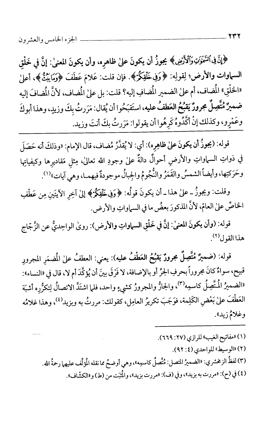 {إِنَّ فِي السَّماواتِ وَالْأَرْضِ} يجوز أن يكون على ظاهره، وأن يكون المعنى: إنّ في خلق السماوات والأرض؛ لقوله: {وَفِي خَلْقِكُمْ}. فإن قلت: علام عطف {وَما يَبُثُّ}، أعلى الخلق المضاف، أم على الضمير المضاف إليه؟ قلت: بل على المضاف، لأنّ المضاف إليه ضمير متصل مجرور يقبح العطف عليه، استقبحوا أن يقال: مررت بك وزيد، وهذا أبوك وعمرو، وكذلك إن أكدوه كرهوا أن يقولوا: مررت بك أنت وزيد.