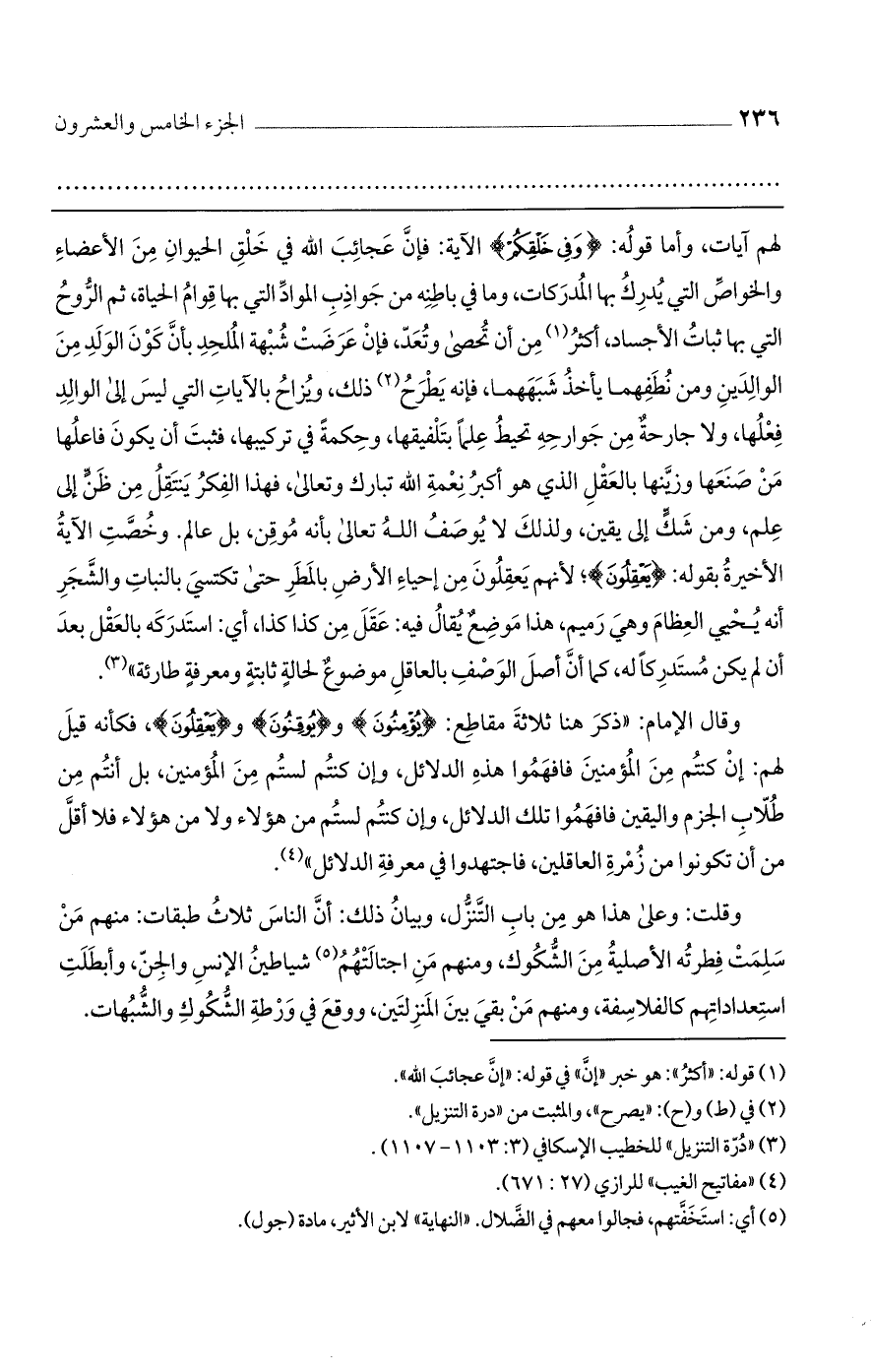 وقال الإمام: "ذكر هنا ثلاثة مقاطع: {يُؤْمِنُونَ} و {يُوقِنُونَ} و {يَعْقِلُونَ}، فكأنه قيل لهم: أن كنتم من المؤمنين فافهموا هذه الدلائل، وإن كنتم لستم من المؤمنين، بل أنتم من طلاب الجزم واليقين فافهموا تلك الدلائل، وإن كنتم لستم من هؤلاء ولا من هؤلاء فلا أقل من أن تكونوا من زمرة العاقلين، فاجتهدوا في معرفة الدلائل".