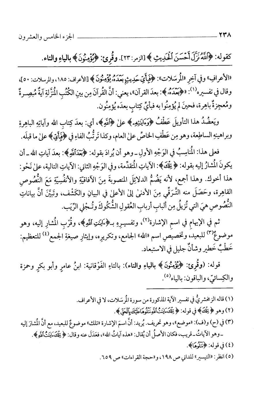 "الأعراف" وفي آخر "المرسلات": {فَبِأَيِّ حَدِيثٍ بَعْدَهُ يُؤْمِنُونَ} [الأعراف: 185، والمرسلات: 50]، وقال في تفسيره: " {بَعْدَهُ}: بعد القرآن"، يعني: أن القرآن من بين الكتب المنزلة آية مبصرة ومعجزة باهرة، فحين لم يؤمنوا به فبأي كتاب بعده يؤمنون.