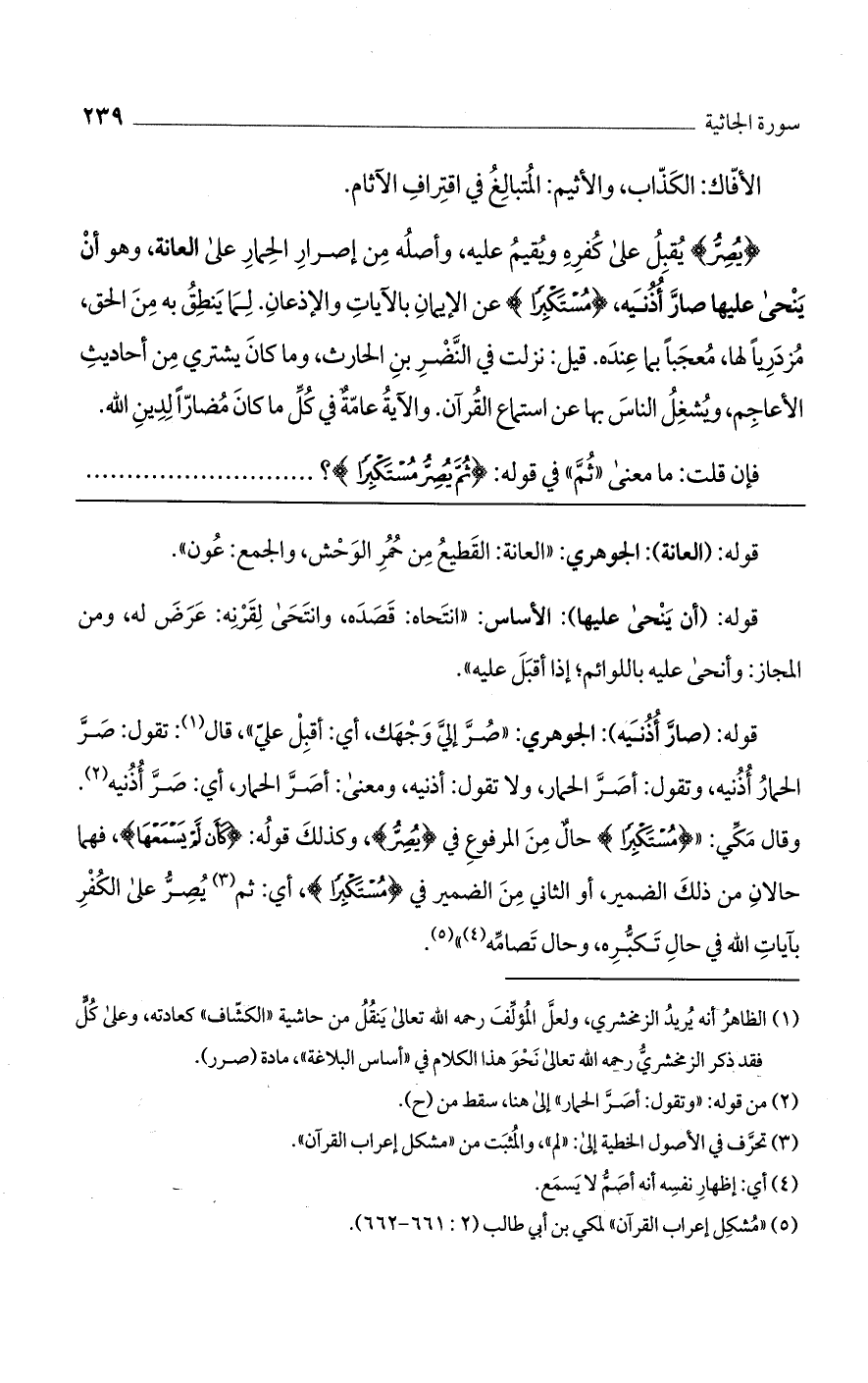 قوله: (صار أذنيه): الجوهري: "صر إلى وجهك، أي: أقبل علي"، قال: تقول: صر الحمار أذنيه، وتقول: أصر الحمار، ولا تقول: أذنيه، ومعنى: أصر الحمار، أي: صر أذنيه. وقال مكي: " {مُسْتَكْبِرًا} حال من المرفوع في {يُصِرُّ}، وكذلك قوله: {كَأَن لَّمْ يَسْمَعْهَا}، فهما حالان من ذلك الضمير، أو الثاني من الضمير في {مُسْتَكْبِرًا}، أي: ثم يصر على الكفر بآيات الله في حال تكبره، وحال تصامه".