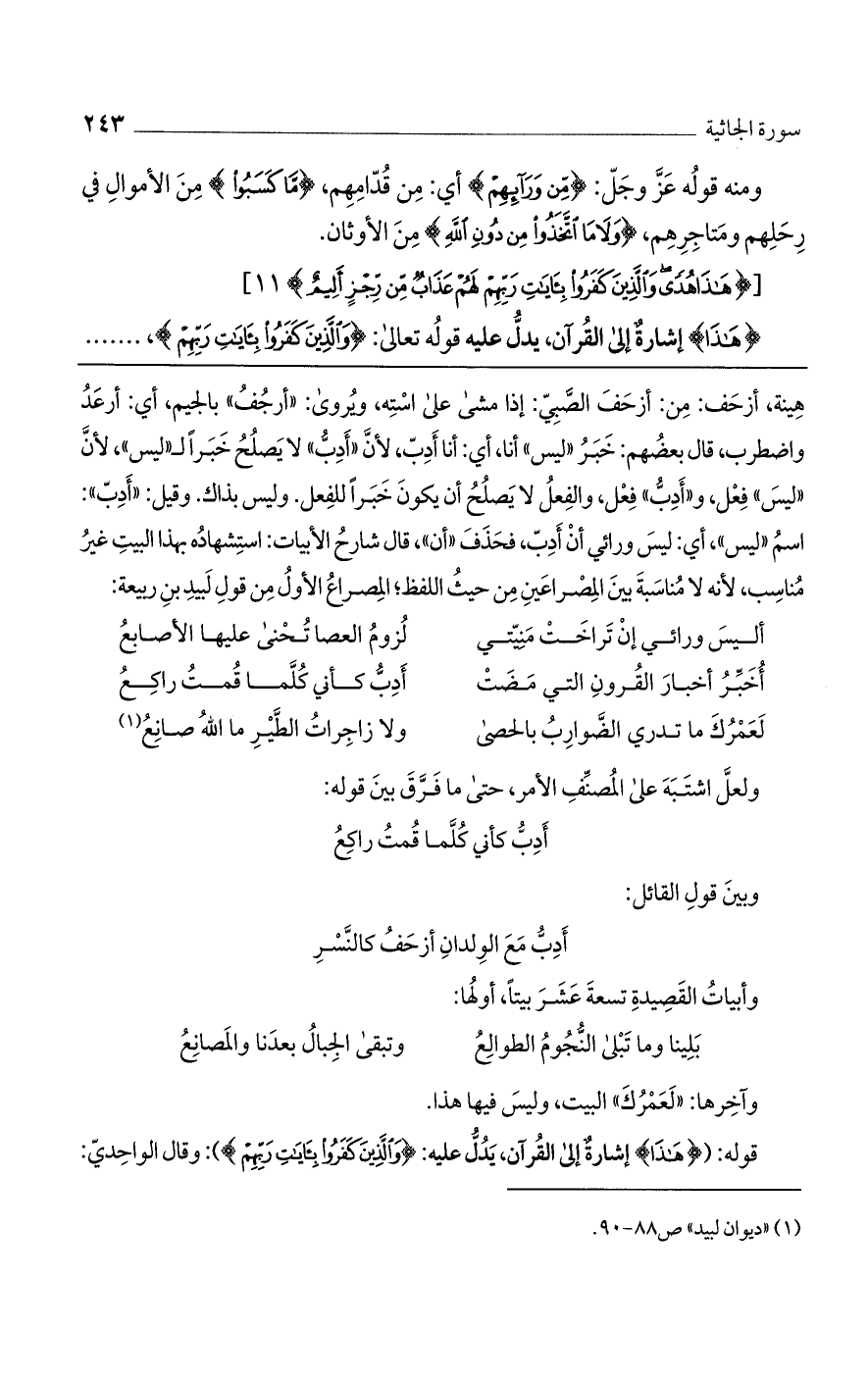 هينة، أزحف: من: أزحف الصبي: إذا مشى على استه، ويروى: "أرجف" بالجيم، أي: أرعد واضطرب، قال بعضهم: خبر "ليس" أنا، أي: أنا أدب، لأن "أدب" لا يصلح خبرًا لـ "ليس"، لأن "ليس" فعل، و "أدب" فعل، والفعل لا يصلح أن يكون خبرًا للفعل. وليس بذاك. وقيل: "أدب": اسم "ليس"، أي: ليس ورائي أن أدب، فحذف "أن"، قال شارح الأبيات: استشهاده بهذا البيت غير مناسب، لأنه لا مناسبة بين المصراعين من حيث اللفظ؛ المصراع الأول من قول لبيد بن ربيعة:
