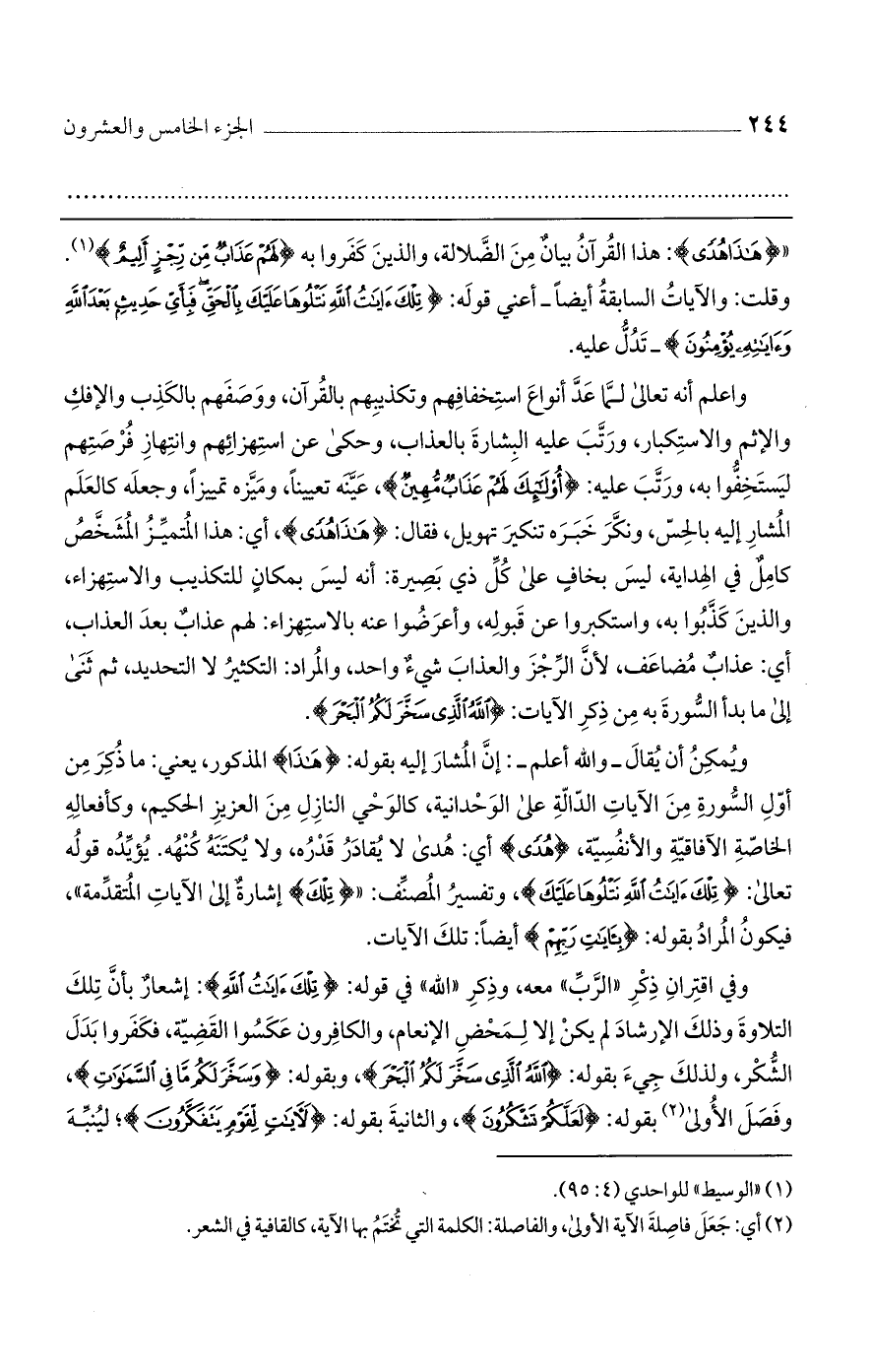 " {هَذَا هُدًى}: هذا القرآن بيان الضلالة، والذين كفروا به {لَهُمْ عَذَابٌ مِّن رِّجْزٍ أَلِيمٌ}. وقلت: والآيات السابقة أيضًا- أعني قوله: {تِلْكَ آيَاتُ اللَّهِ نَتْلُوهَا عَلَيْكَ بِالْحَقِّ فَبِأَيِّ حَدِيثٍ بَعْدَ اللَّهِ وآيَاتِهِ يُؤْمِنُونَ} - تدل عليه.